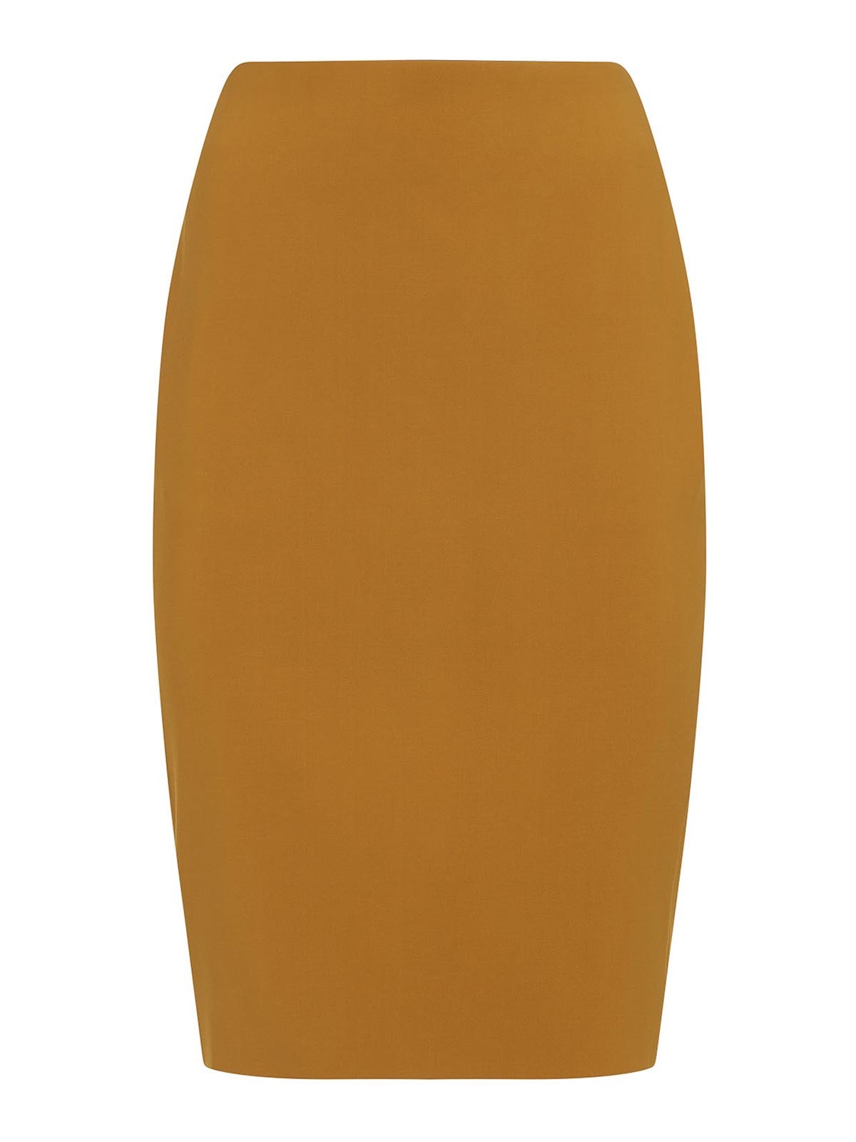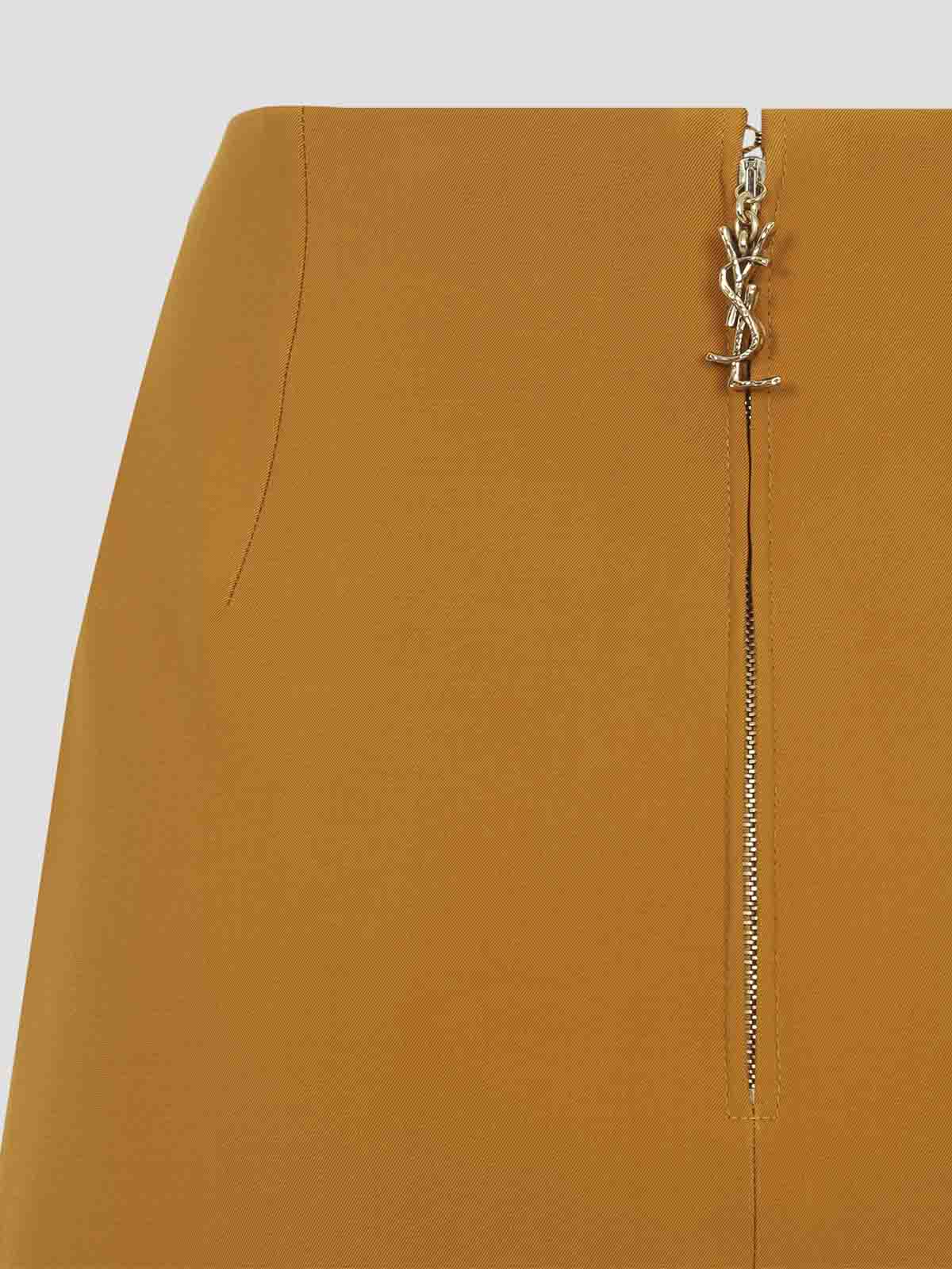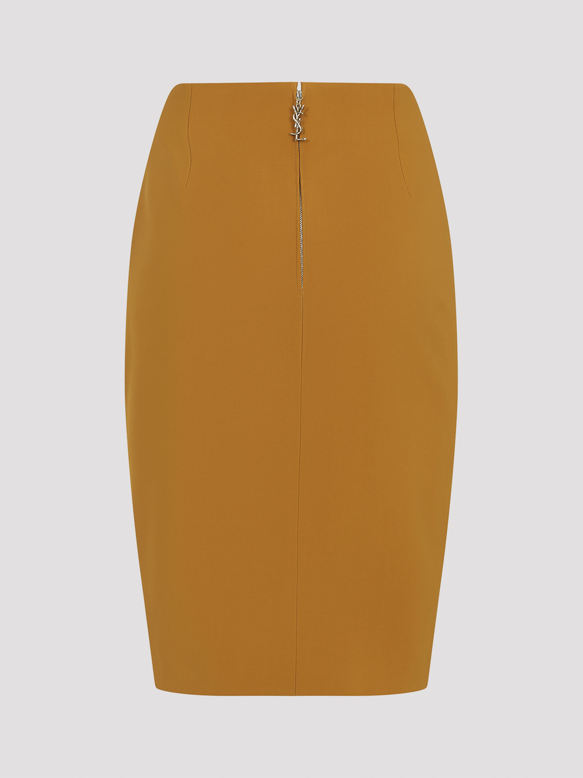 Saint laurent ochre yellow skirt. crafted in viscose, cupro and elastane blend. back gold-tone zipped fastening with signature ysl detail, pencil design, midi-length, straight hem.