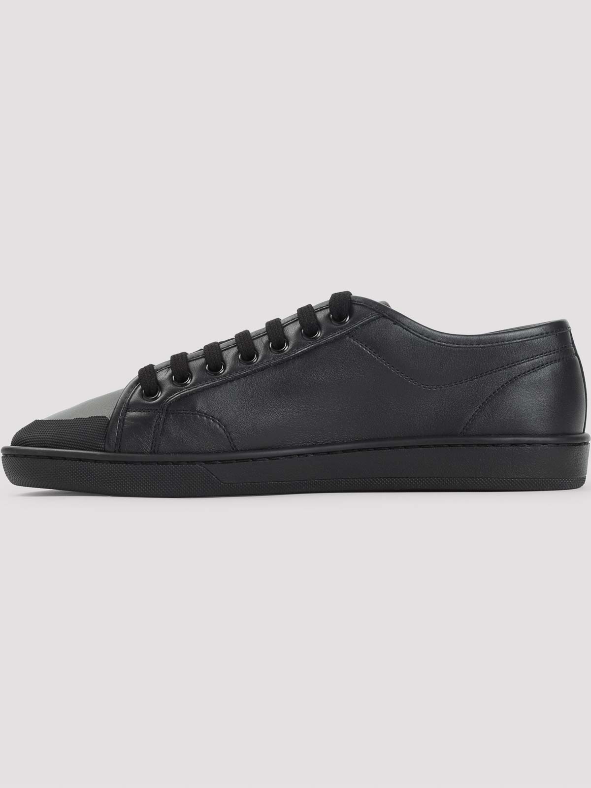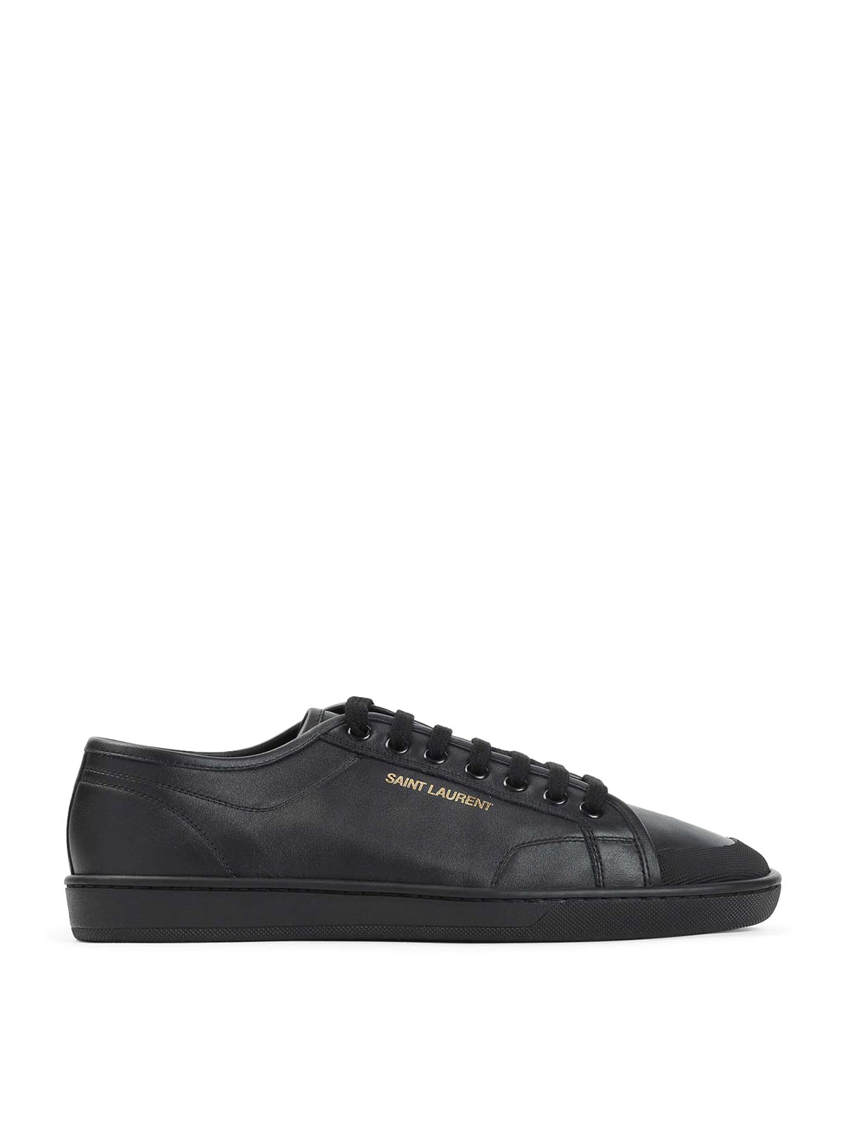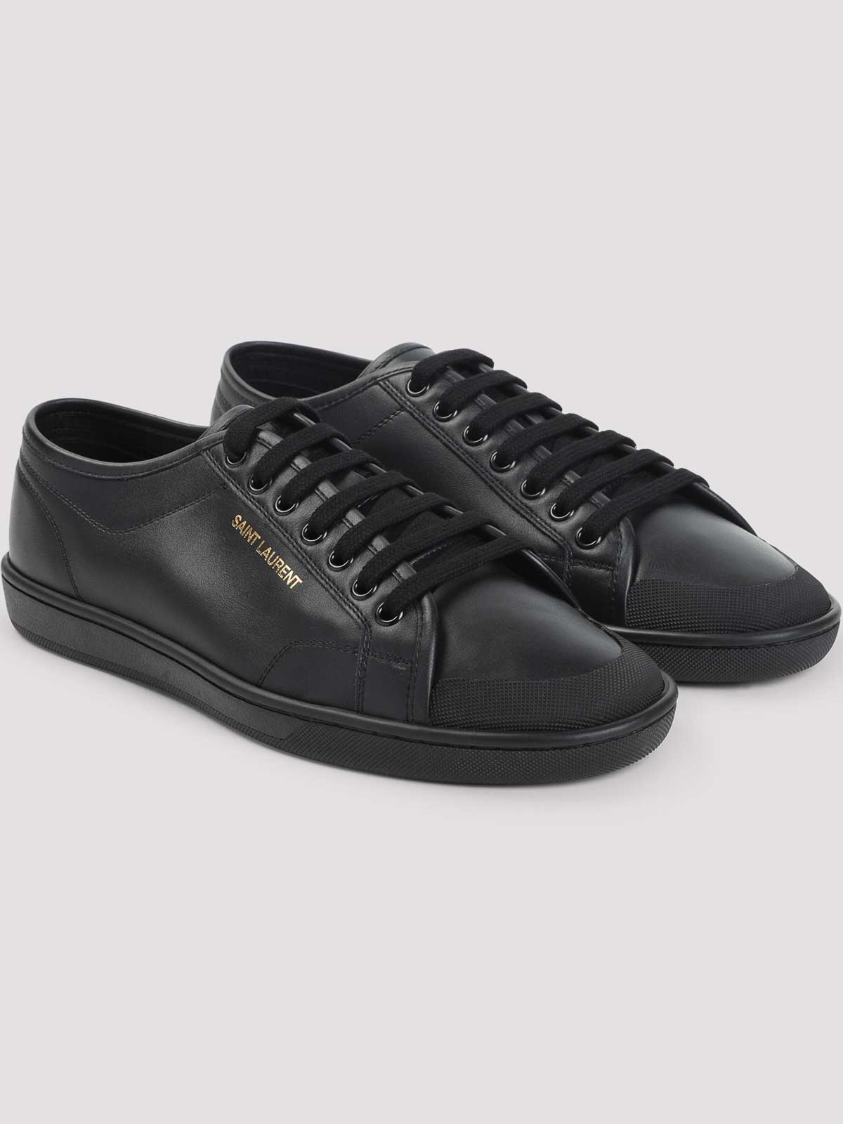 Saint laurent sl39 black calf leather sneakers. crafted from black calf leather, round toe with tonal rubber coating detail, lace-up fastening, tonal stitching, golden-toned stamped logo on the side, branded leather insole, black rubber outsole.