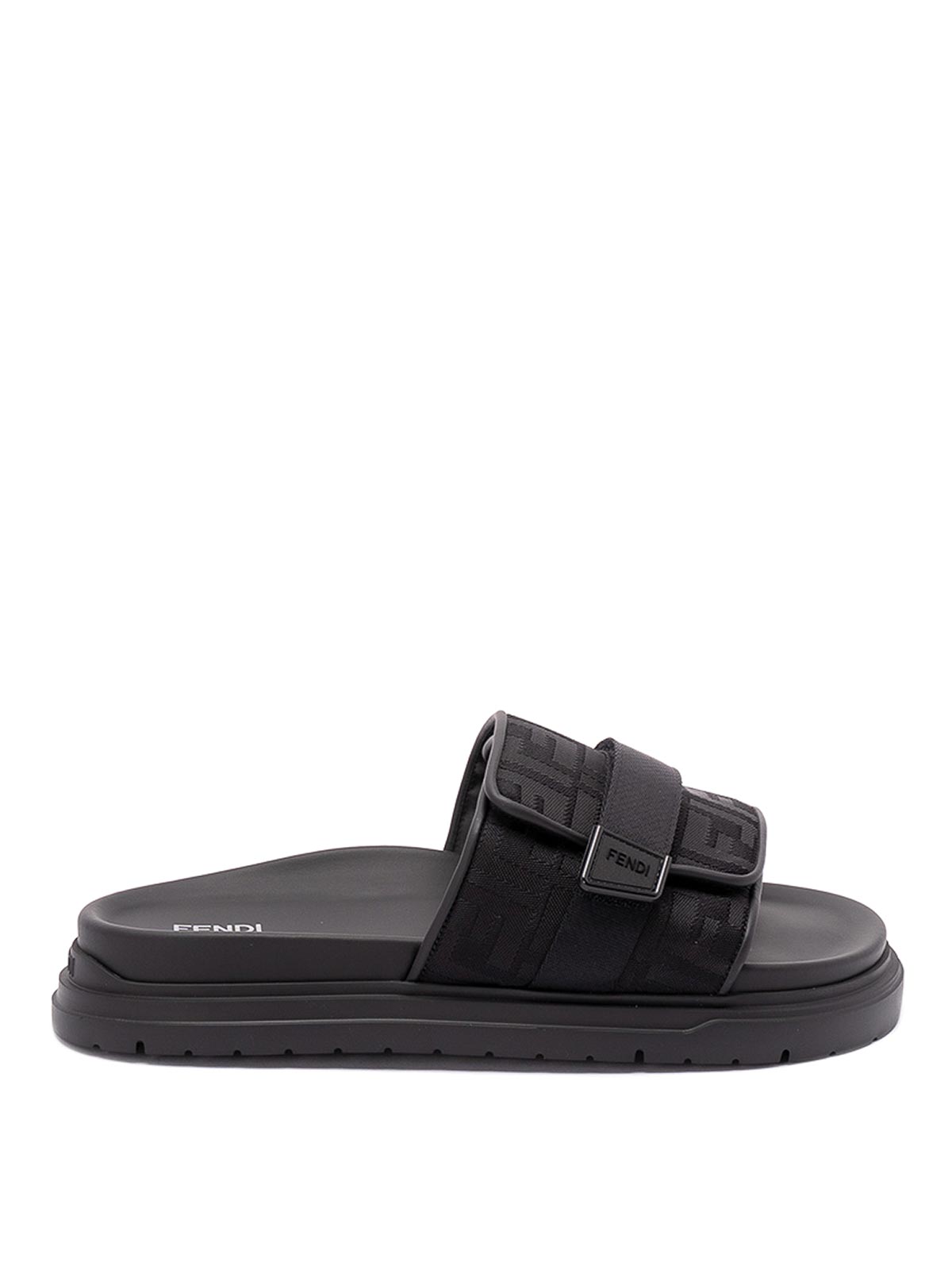 Slides with an essential design with a band decorated with the FF motif. Flat sole for everyday comfort.