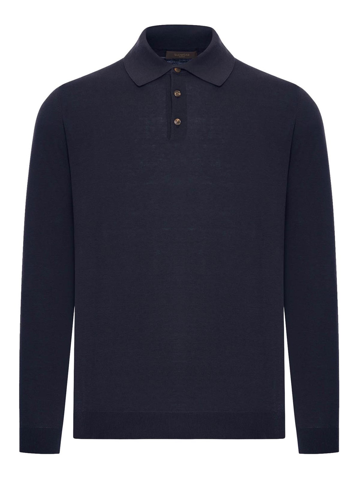 polo collar, 3-button closure, long sleeves, plain knit, ribbed trim, gauge: 18, the model is 1.87 m tall and wears a size 50, slim fit, color: dark navy