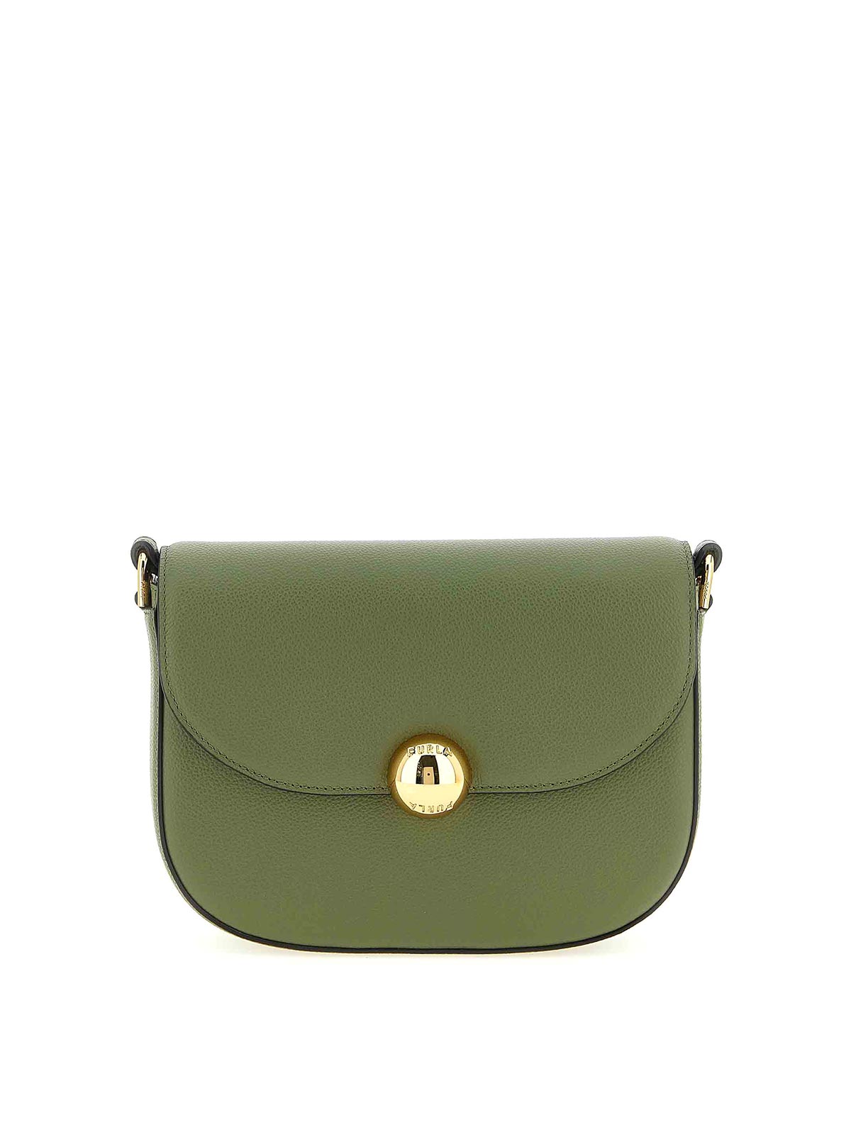 Small fine leather 'furla moonlight' crossbody bag with a light hammered finish, magnetic flap closure with iconic metal 'sfera' logo on the front, embossed logo on the back, and adjustable shoulder strap.