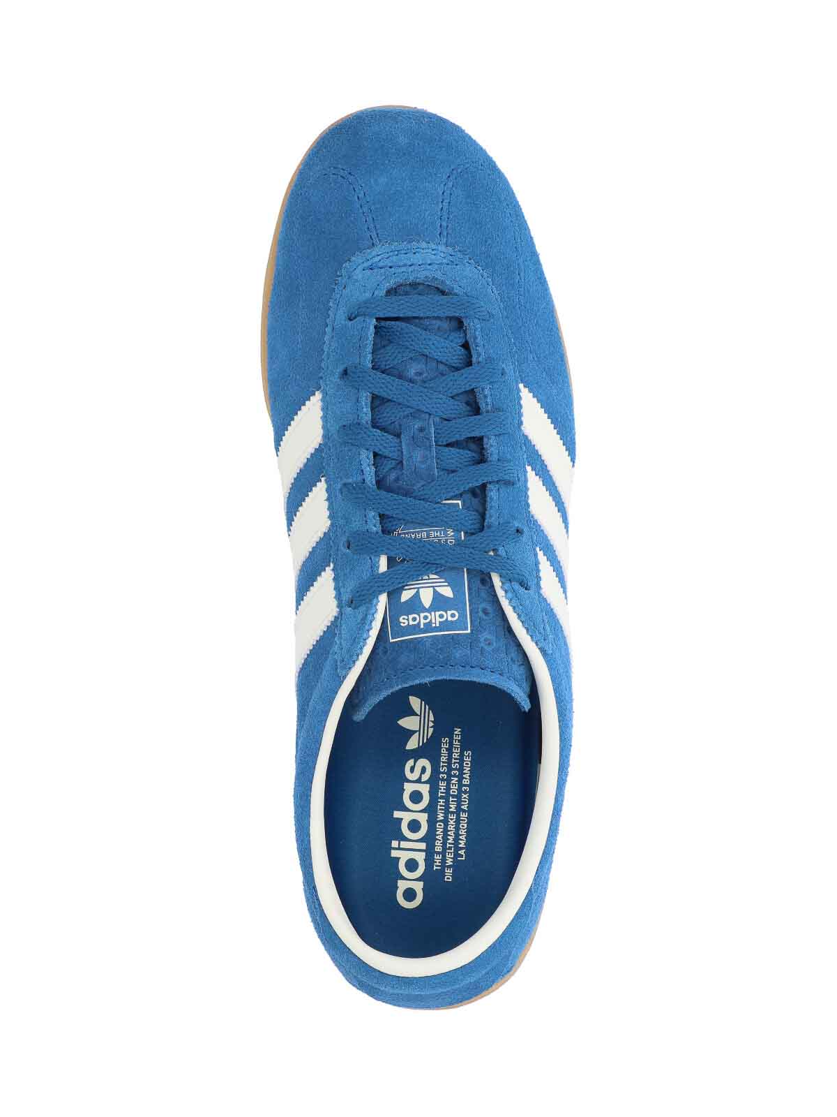 adidas gazelle sneakers in blue leather, round toe, upper lace closure, logo on tongue, contrasting iconic side bands, rubber sole.