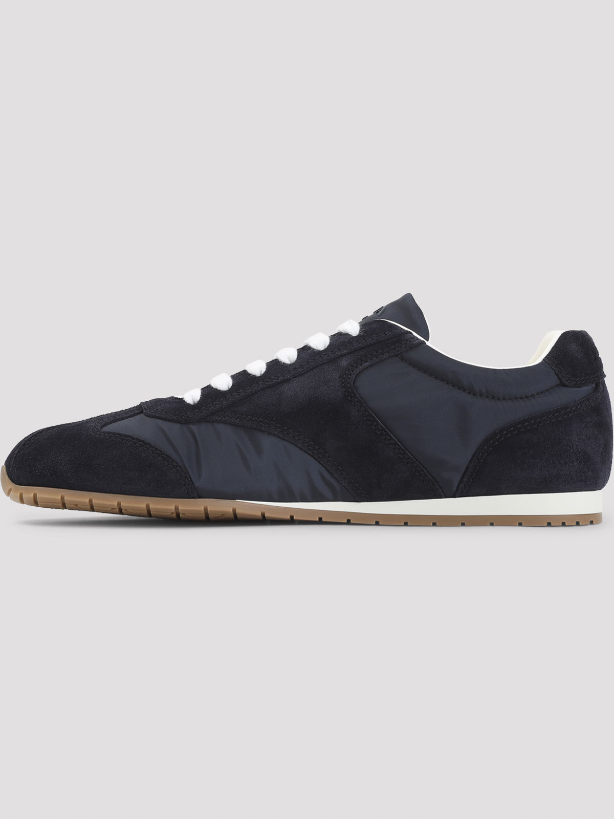 Prada blue spark sneakers. crafted in blue polyamide fabric, round toe, top contrasting white lace-up fastening, embossed lettering logo, side gold-tone lettering logo, back engraved logo, white perforated lining, white sole.