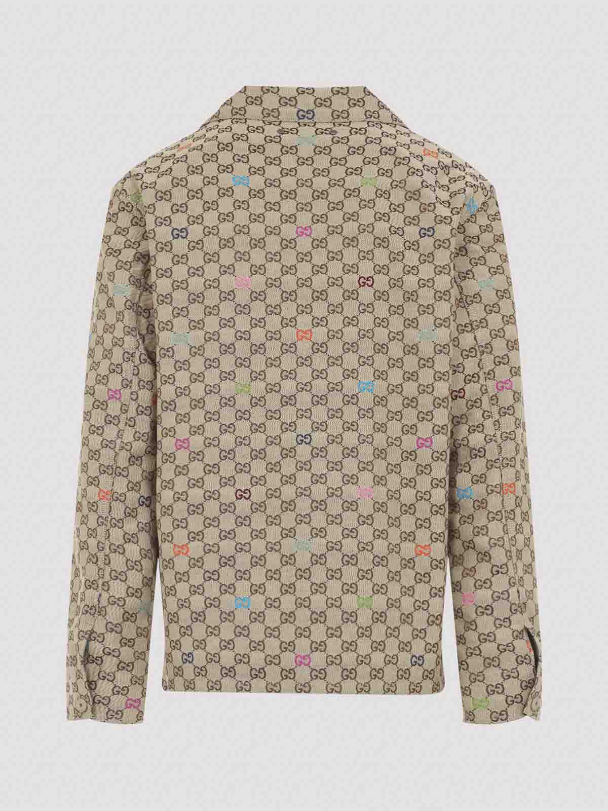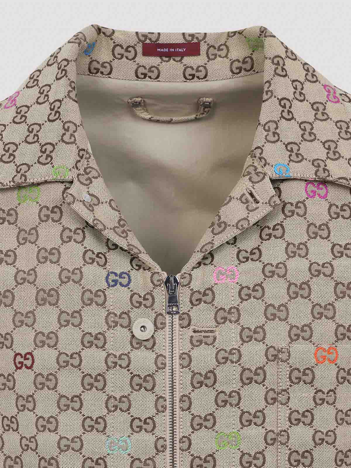 Gucci camel beige cotton spw gg jacket. crafted in cotton fabric, bowling collar, front zipped fastening, side pockets, long sleeves, buttoned cuffs, straight hem, fully beige polyester lining. contrasting dark brown signature gg logo pattern all-over, multicolor gg logo details.