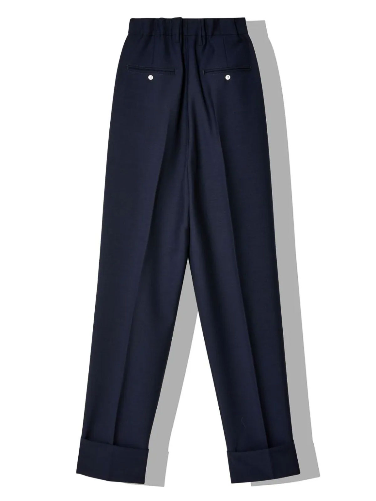 Navy blue, blend pressed crease belt loops concealed straight leg two side inset pockets two rear button, jetted pockets turn, up cuffs partial