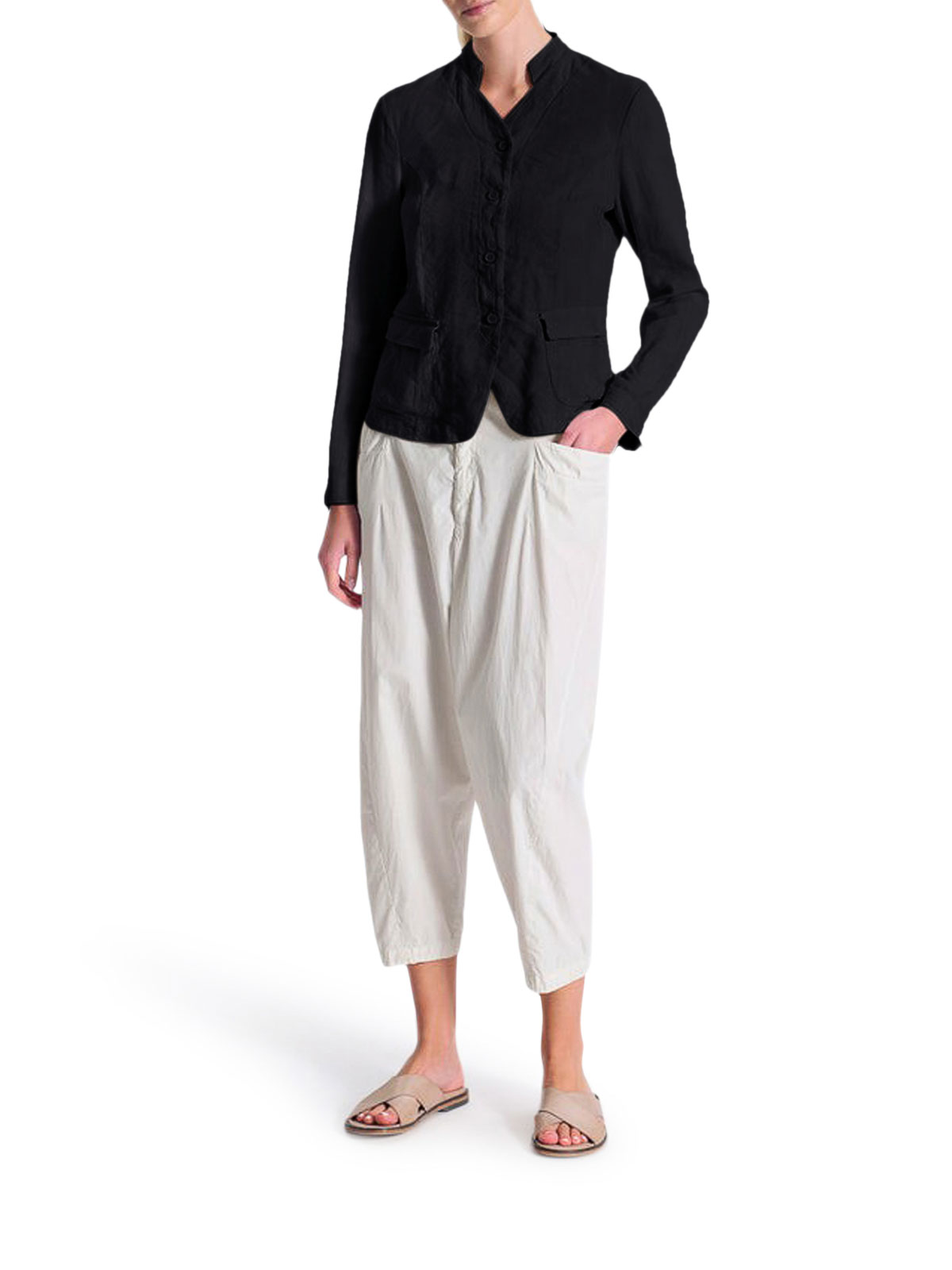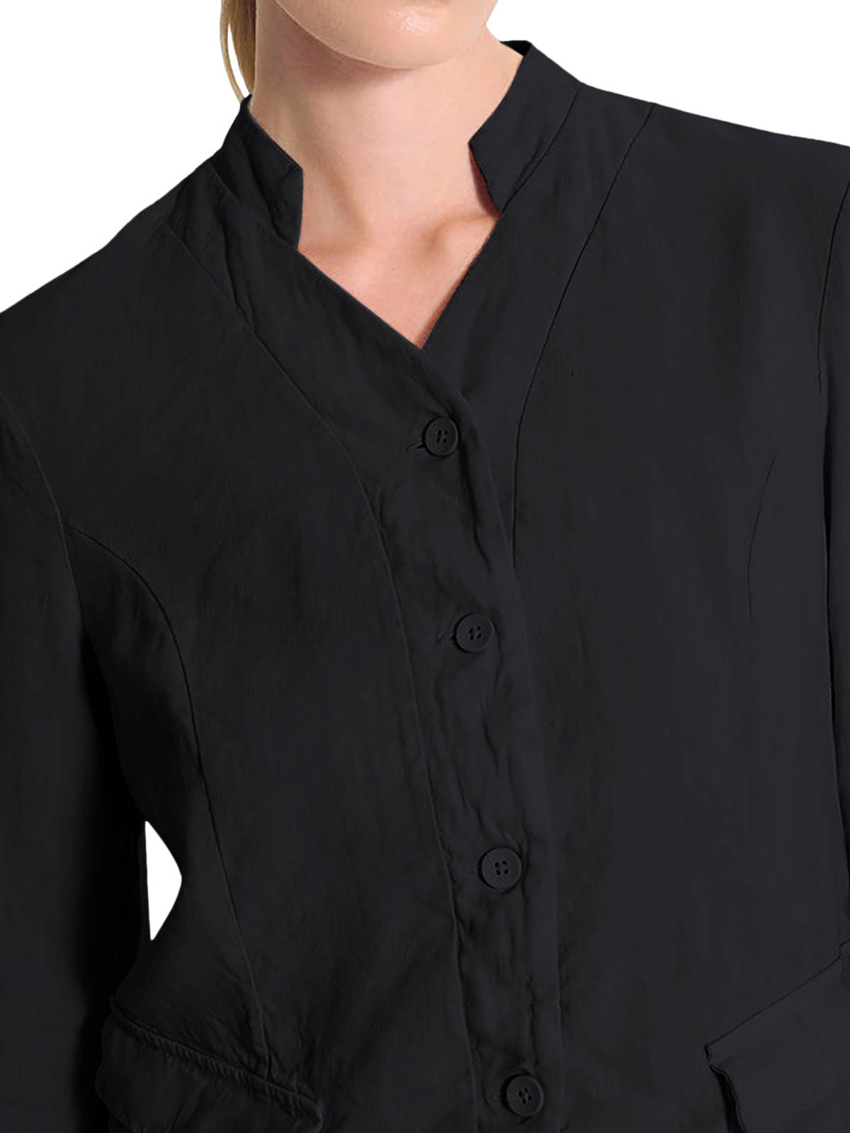 short jacket, band collar, shaped button placket, front patch pockets with flaps, unlined, slightly tailored, linen-viscose blend, front and back side panels, dyed, color: nero