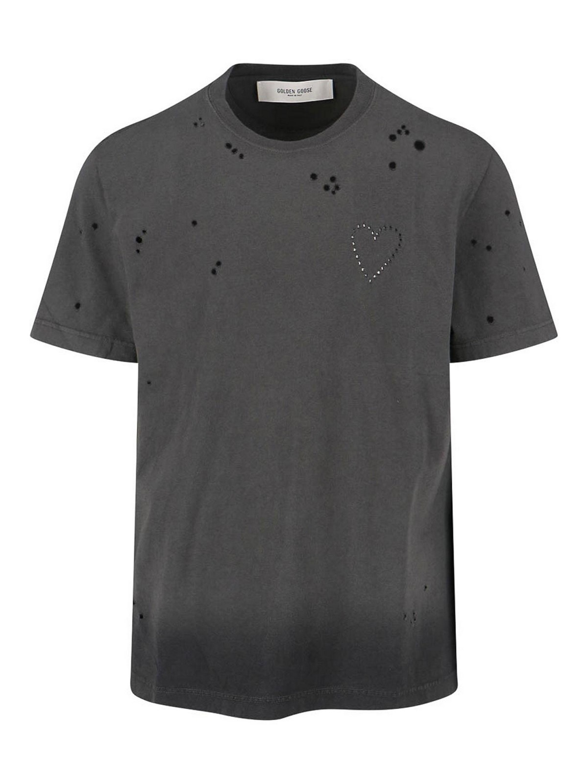 Golden Goose journey T-shirt in gray cotton, worn effect, crew neck, short sleeves, destroyed details, straight hem.