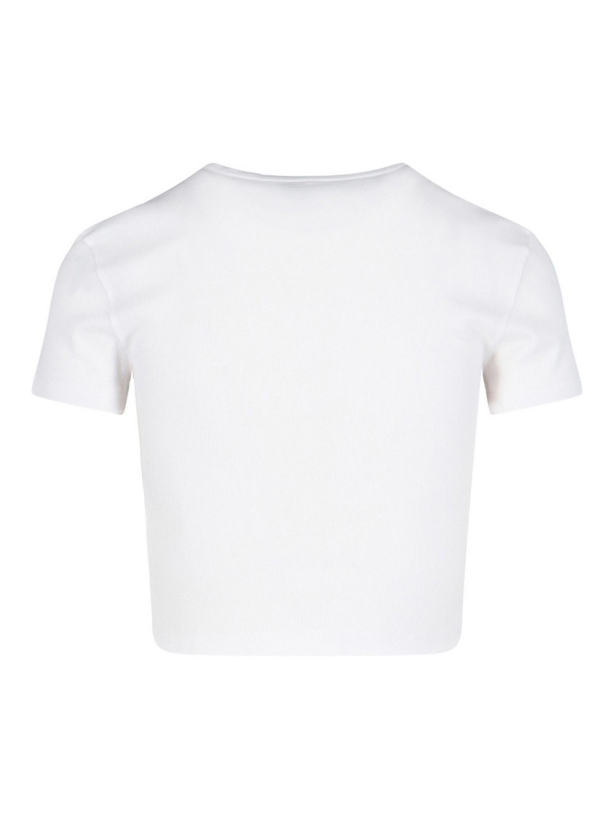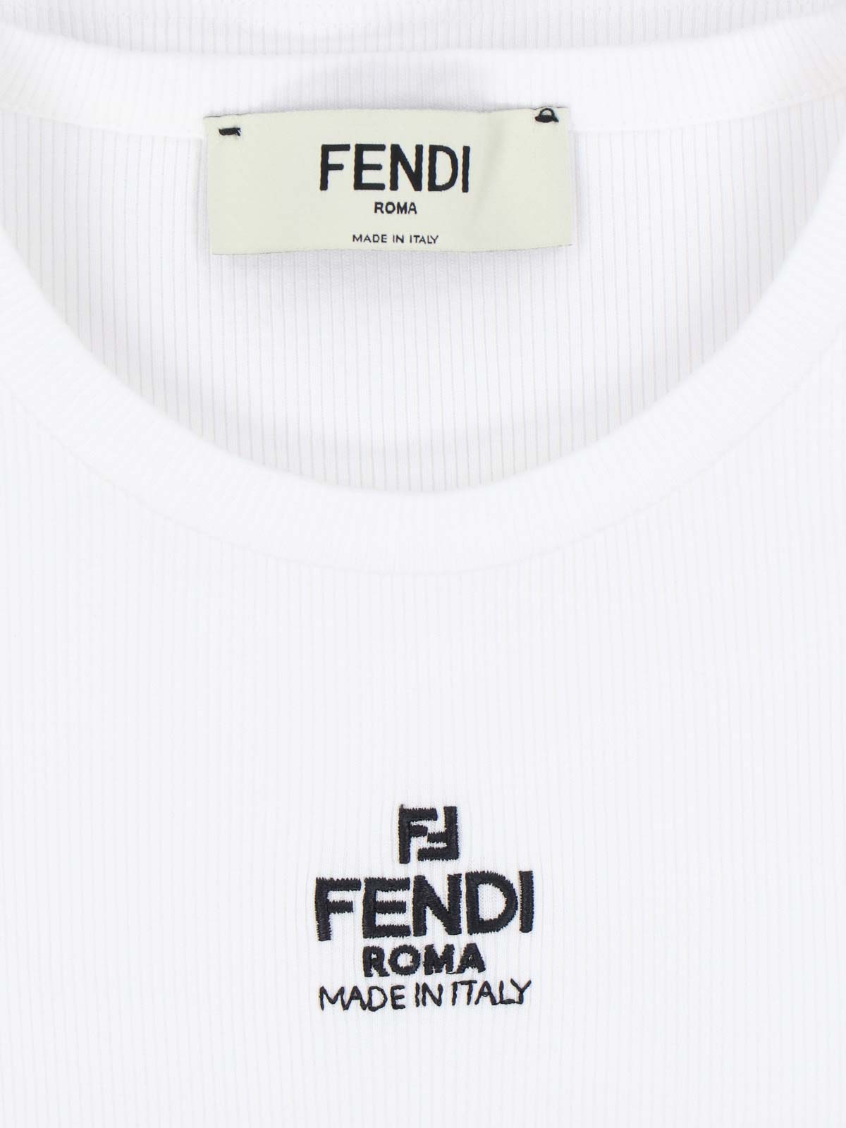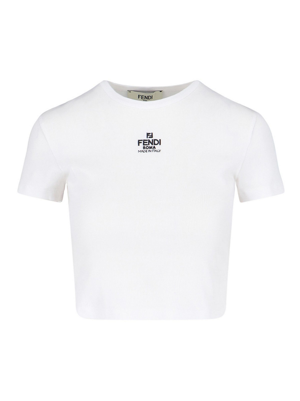 Fendi logo T-shirt in white cotton, ribbed workmanship, crew neck, short sleeves, contrasting embroidered logo detail on the front, straight hem.