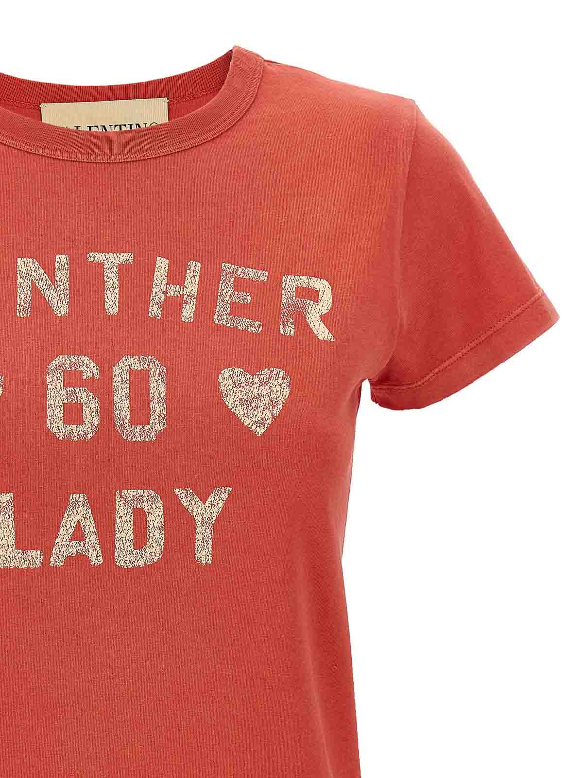 Cotton jersey t-shirt with 'panther lady' print on the front craqu effect, 'chez valentino' patch on the back, crew neck, and short sleeves.