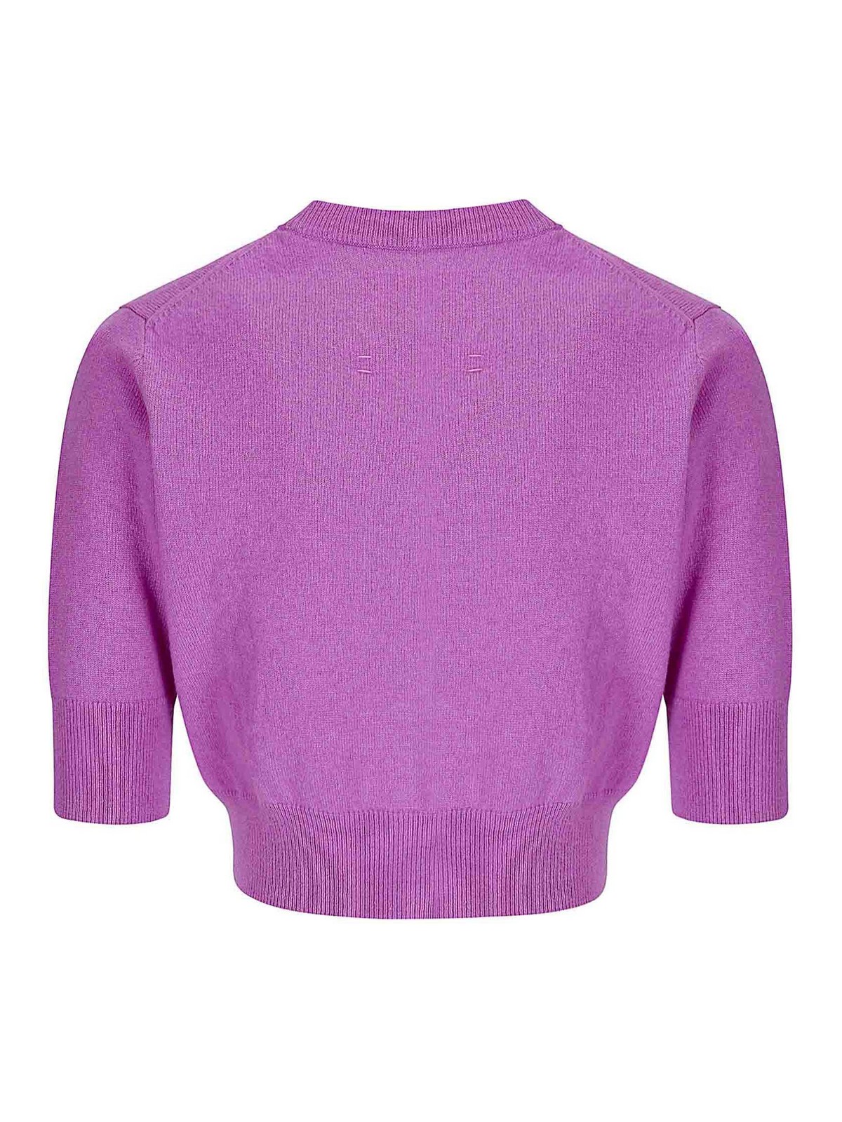 Very short cashmere top, button closure, short sleeves, contrasting edges.