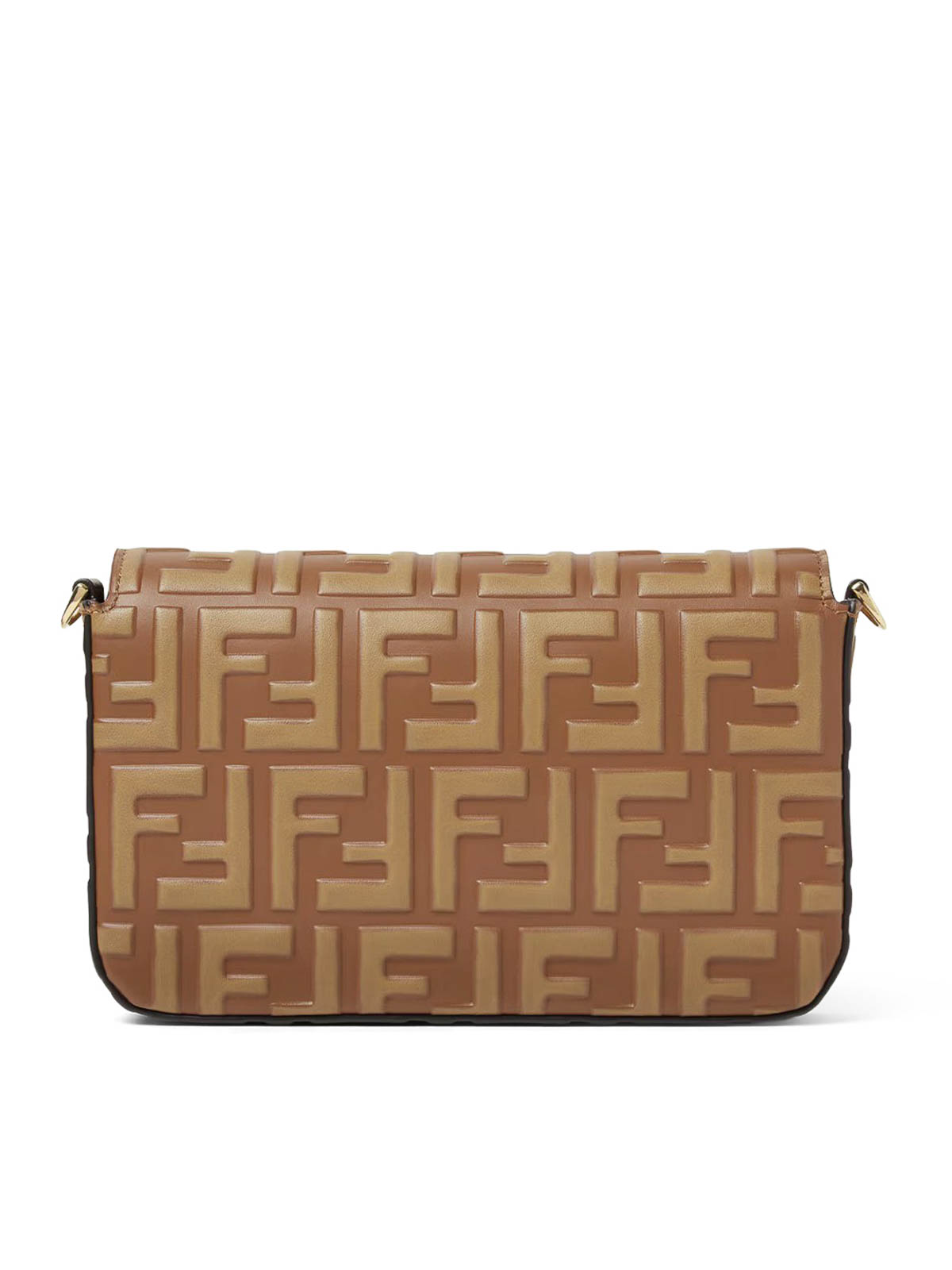 ff diamonds wallet, compact design, geometric flap, diagonal ff logo, internal compartment with 4 card slots, removable thin chain shoulder strap, calfskin with embossed ff motif in shades of tan and light brown, gold-finish metalware, height: 11 cm, depth: 3 cm, width: 18 cm, shoulder strap drop: 54 cm, color: brown