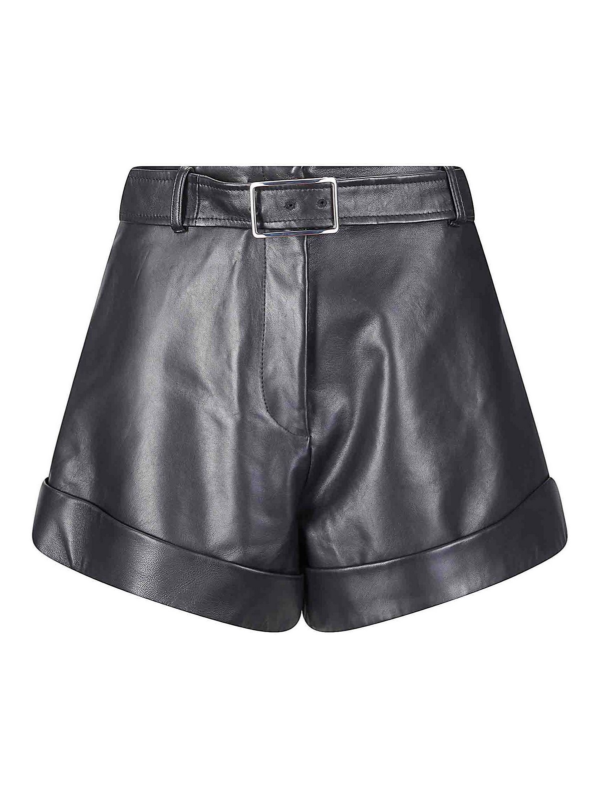 Short leather Bermuda shorts, with turn-up bottom and belt with buckle, side French pockets and welt back.