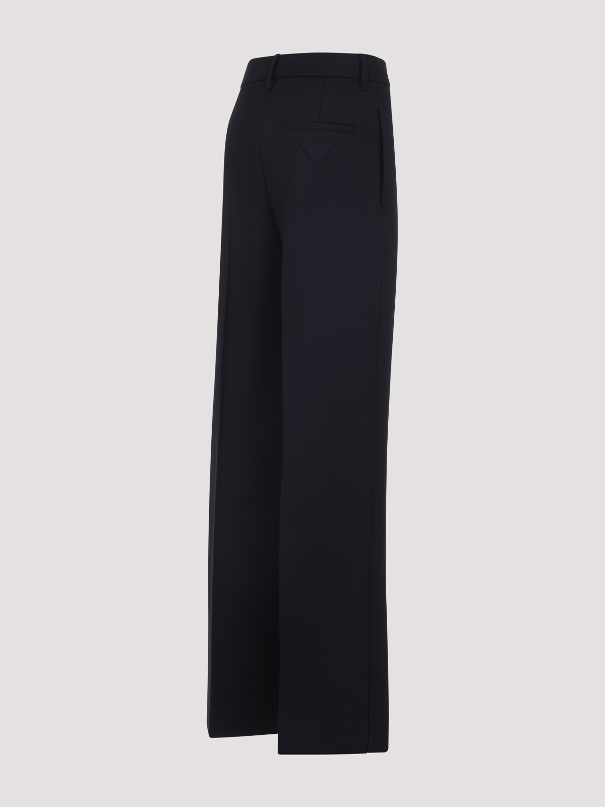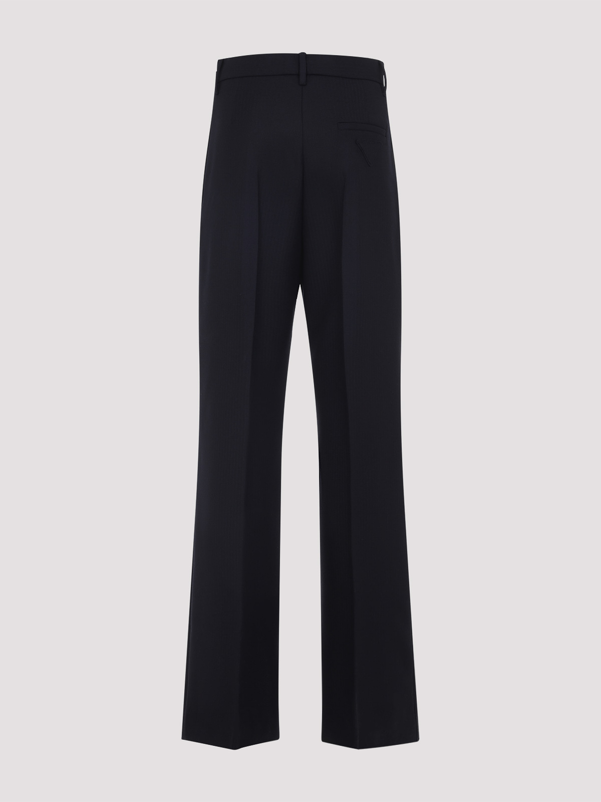 Prada blue virgin wool pants. dark blue virgin wool, high waist, belt loops, front concealed fastening, inseam side pockets, central pressed creases, welt pocket and triangle logo patch on the back, straight leg.