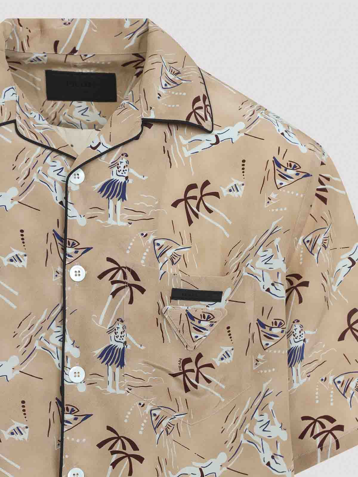 Prada printed silk blend bowling shirt. pink viscose and silk blend, hawaii print all over. short sleeves, oversized fit, bowling collar. classic breast pocket, straight hem, mother-of-pearl button closure.