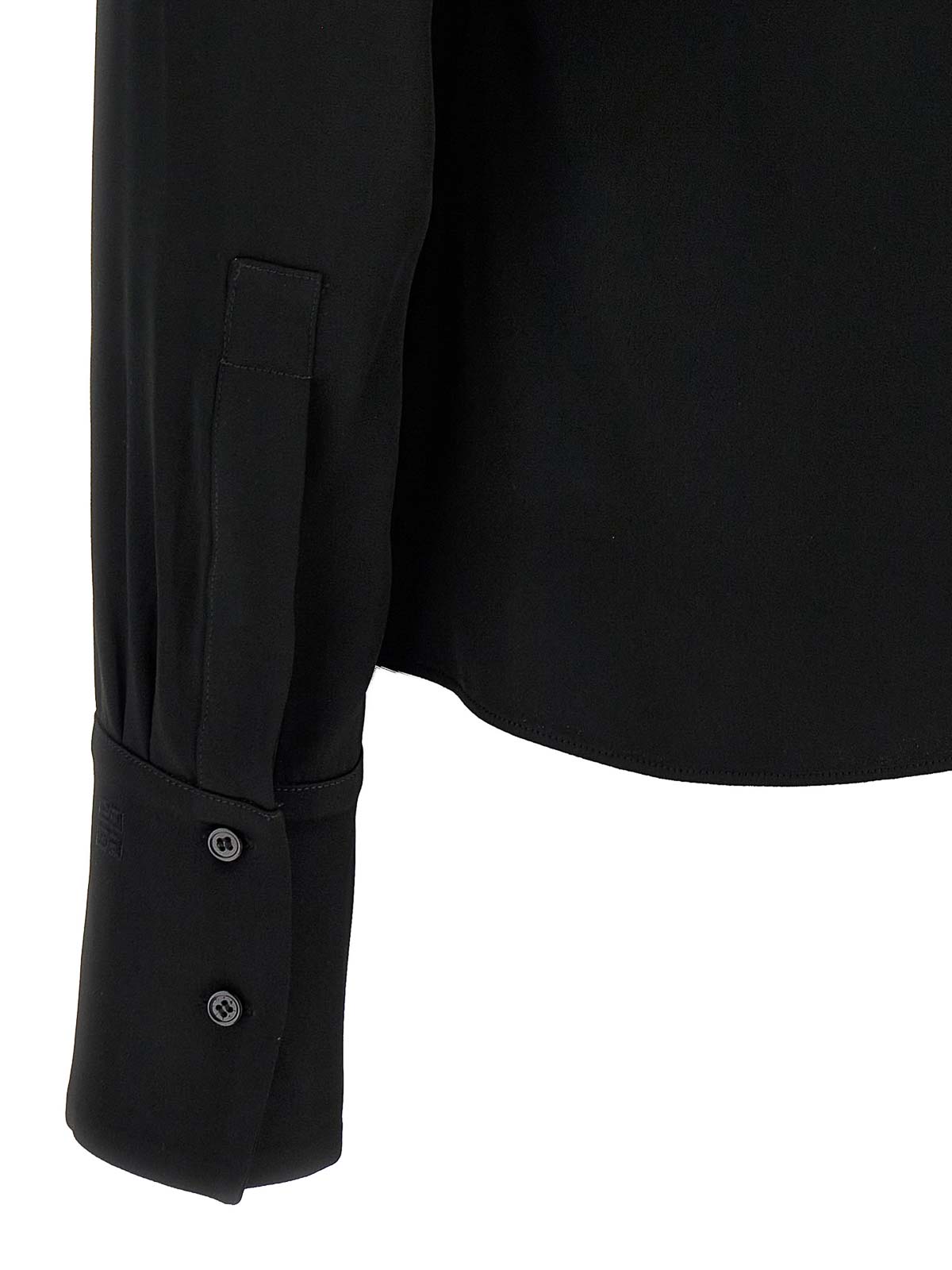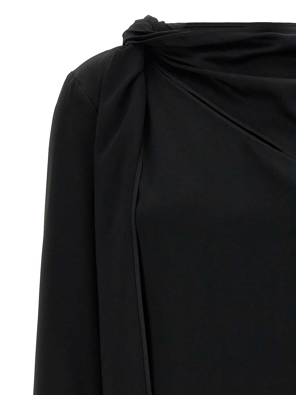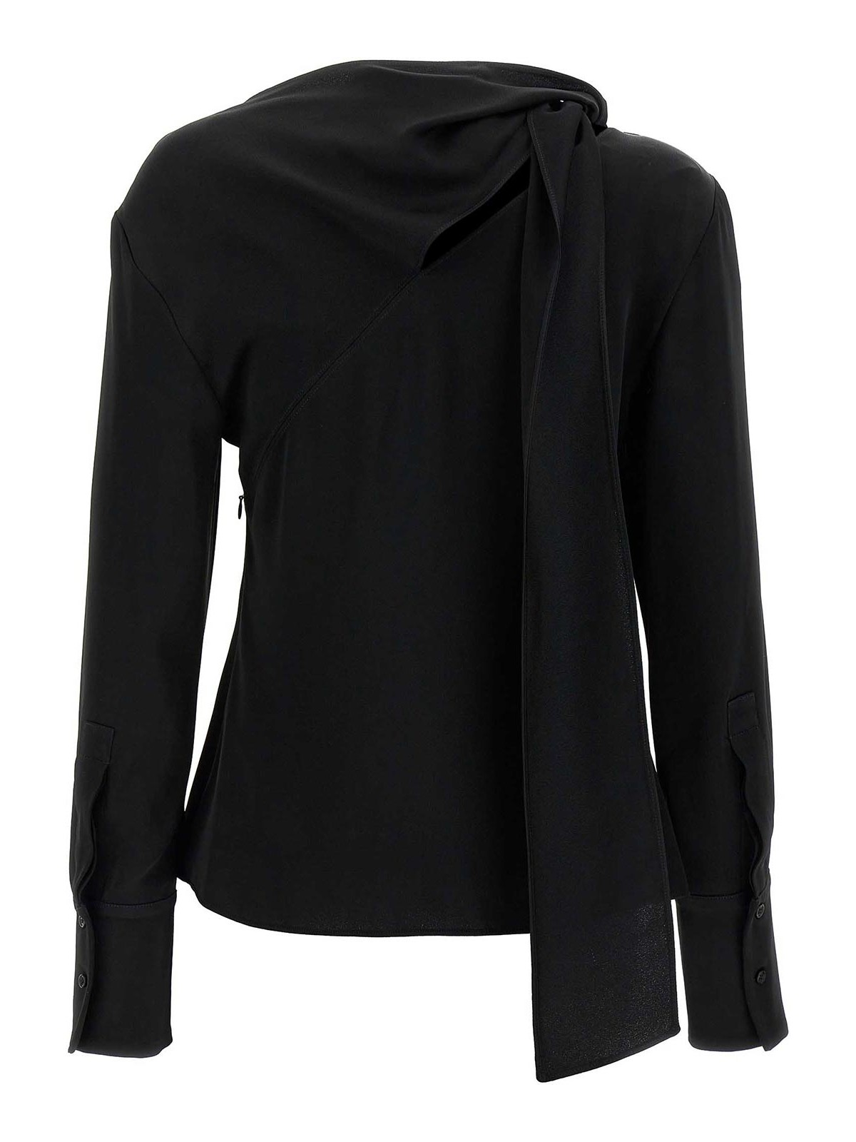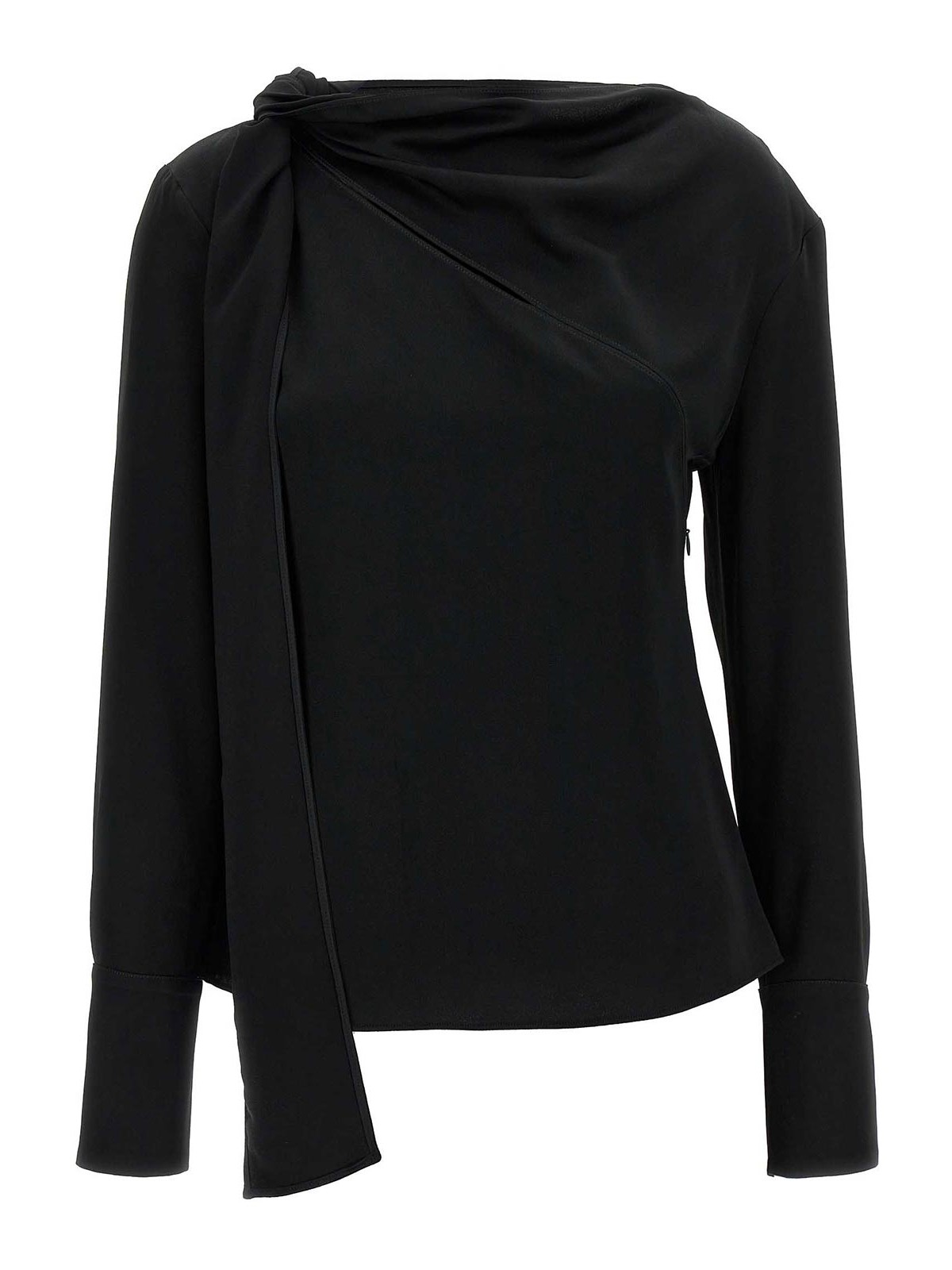 Viscose blend blouse with adjustable sash at the neck, side zip closure, long cuffed sleeves.