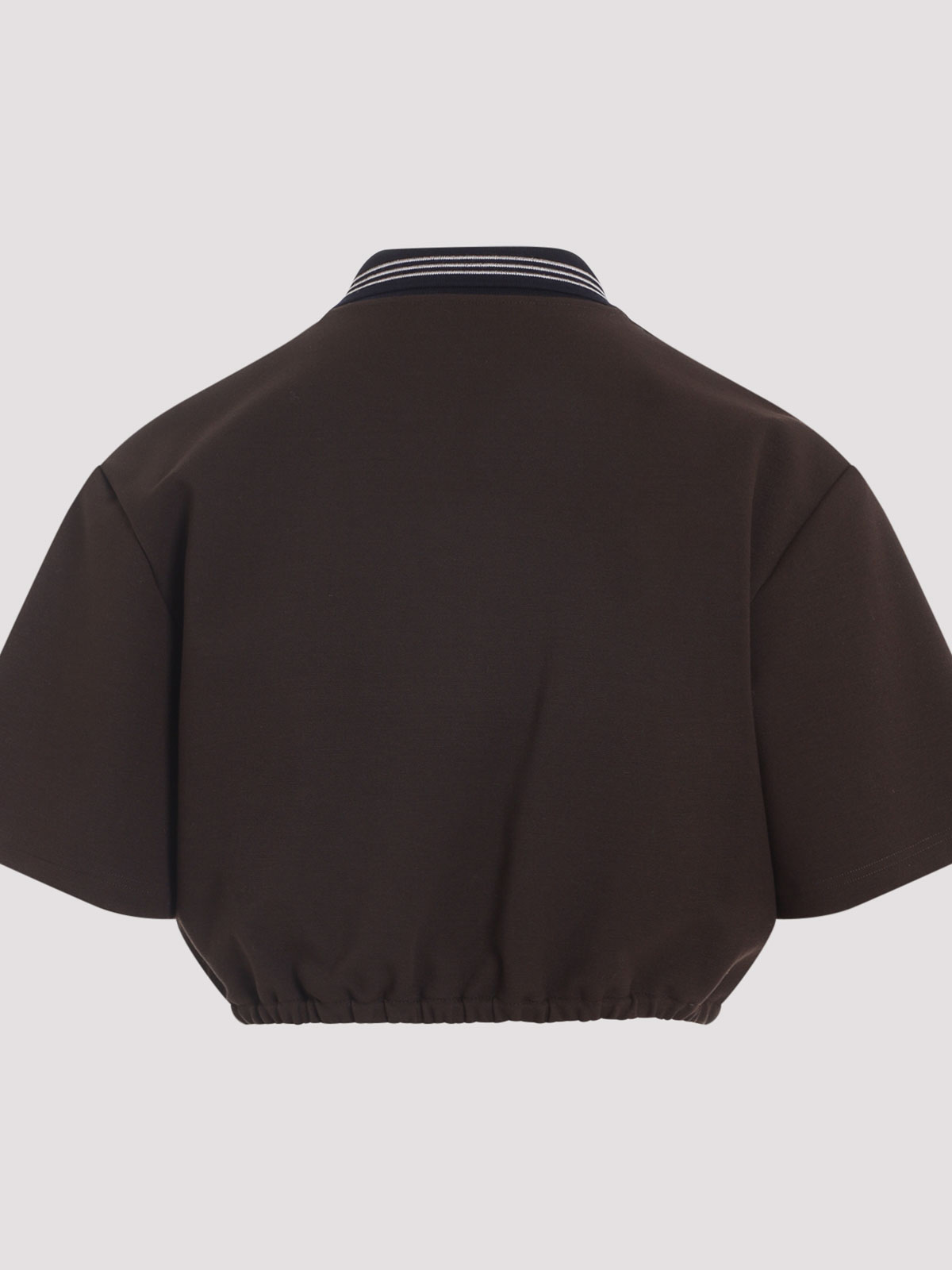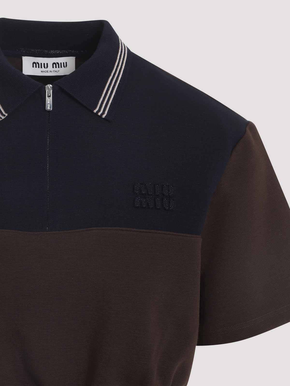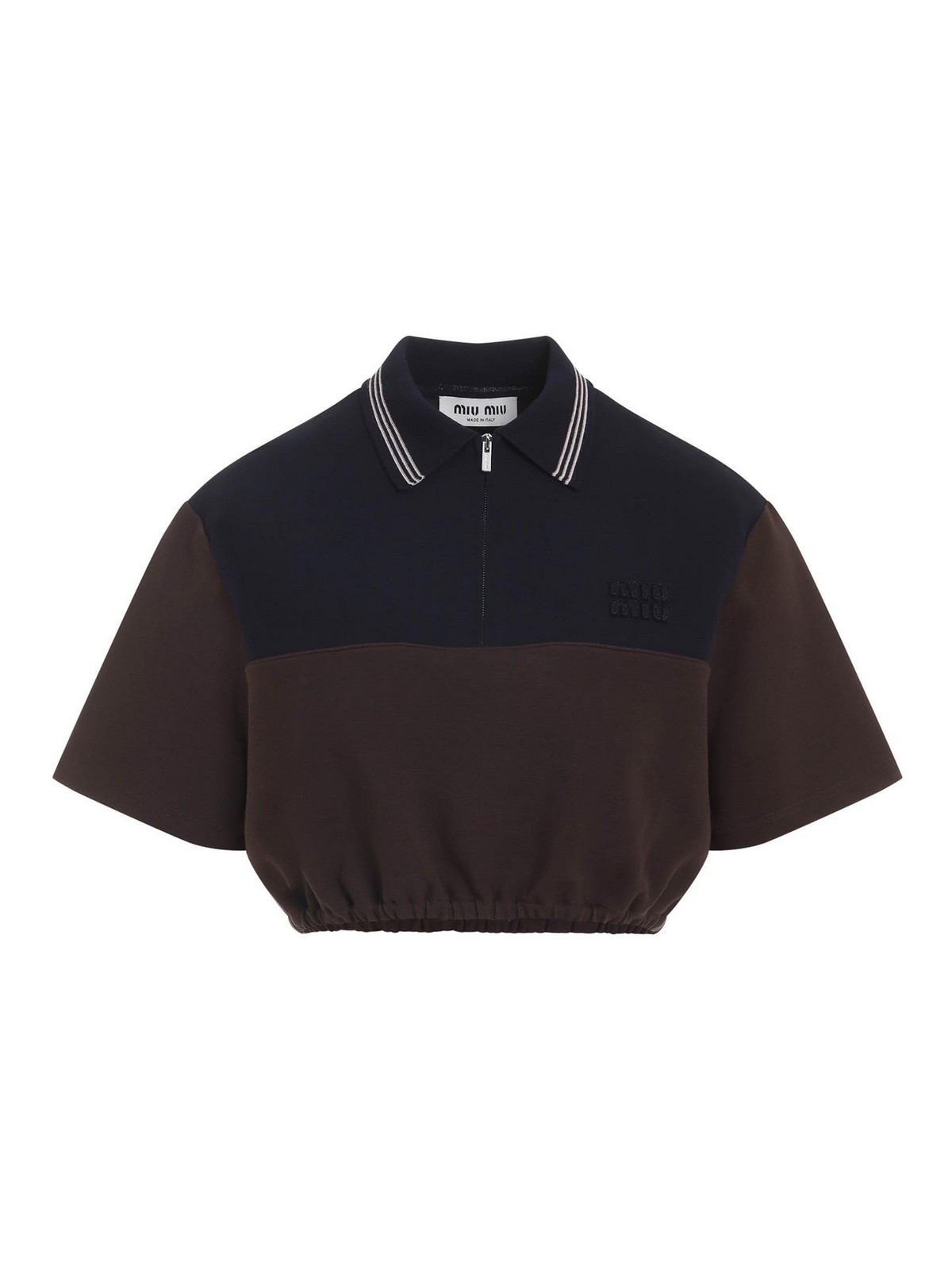 Miu miu cacao and blue cropped viscose top. cacao and blue viscose blend, polo collar, front zip fastening, short sleeves, cropped elasticated waist. regular fit, logo on chest.