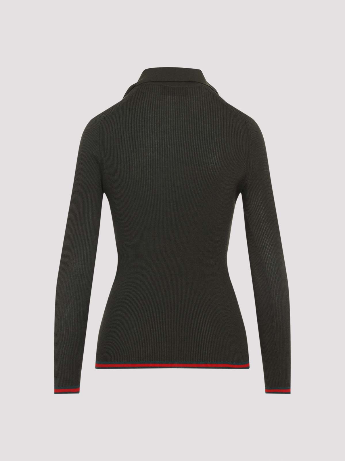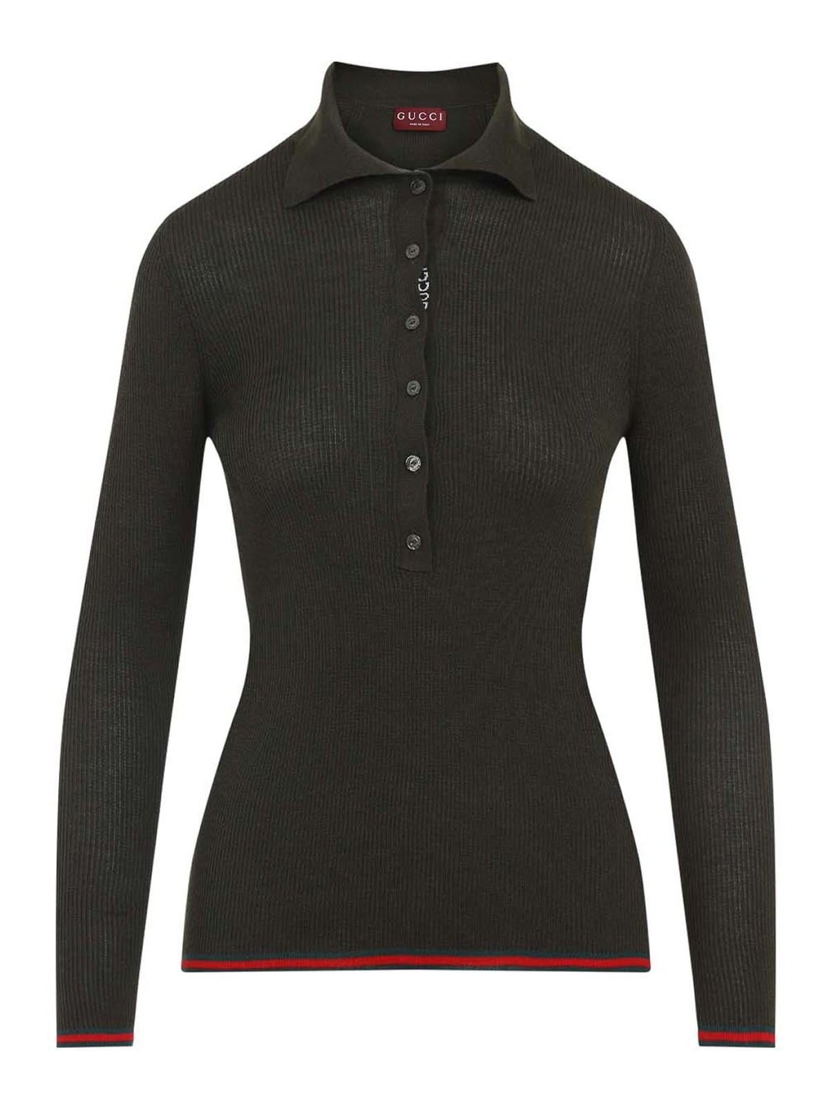 Gucci web forest green polo forest green and ribbed all over polo collar button logo jacquard on the placket long sleeves iconic red and green web at the hem and cuffs straight hem