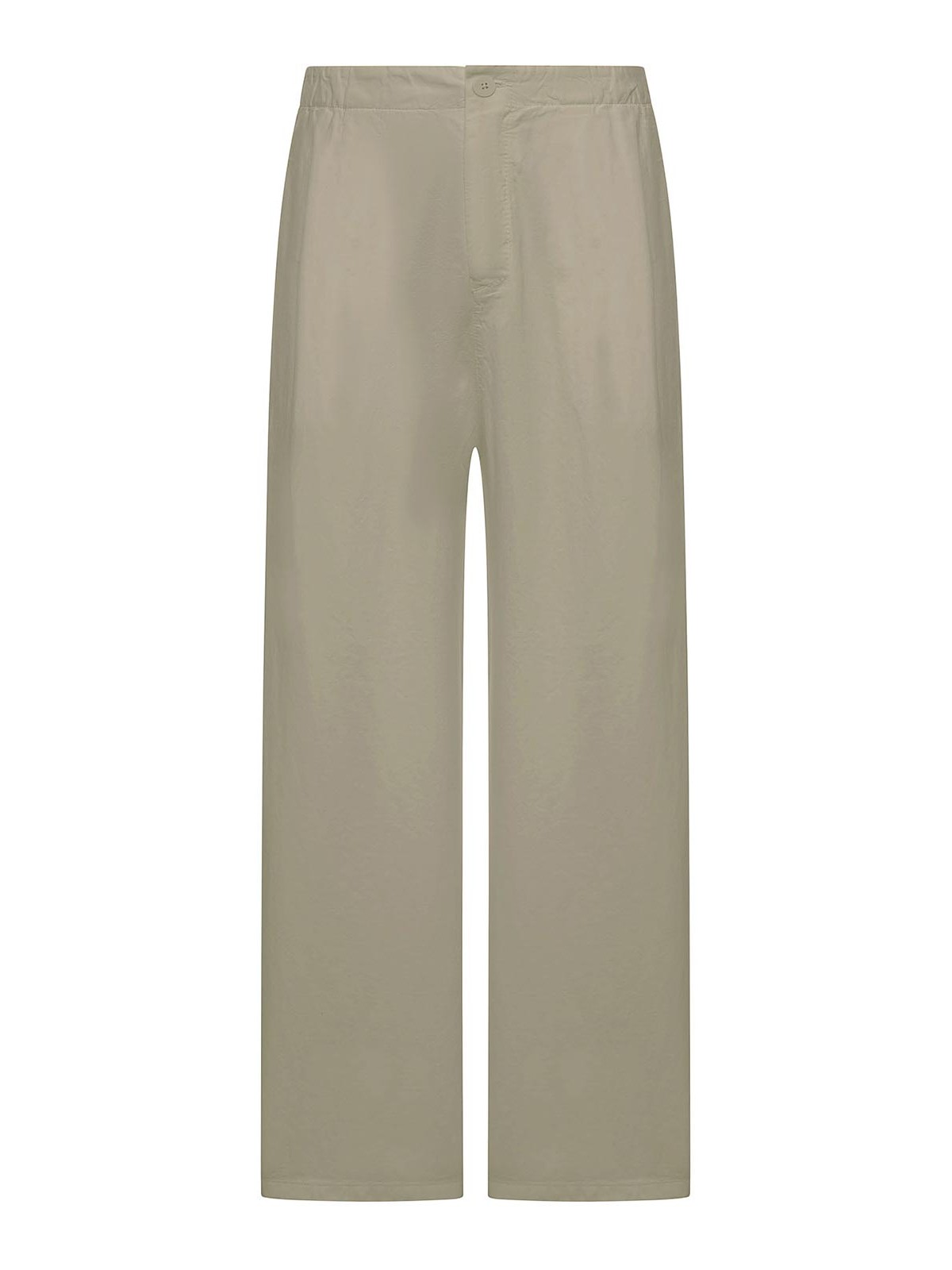 regular elastic waist, front button and hidden zip closure, inset side pockets, wide leg, straight leg, hem finished with tone-on-tone stitching, relaxed fit, color: clay
