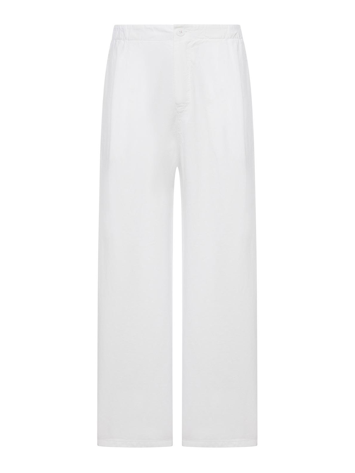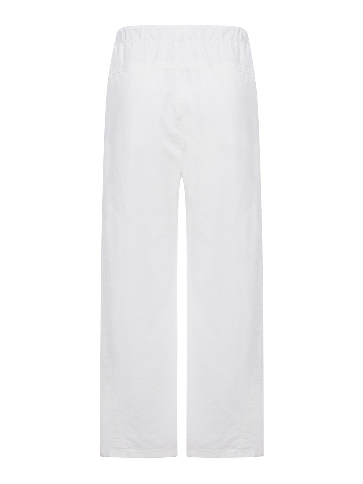 regular elastic waist, front button and hidden zip closure, inset side pockets, wide leg, straight leg, hem finished with tone-on-tone stitching, relaxed fit, color: optical white