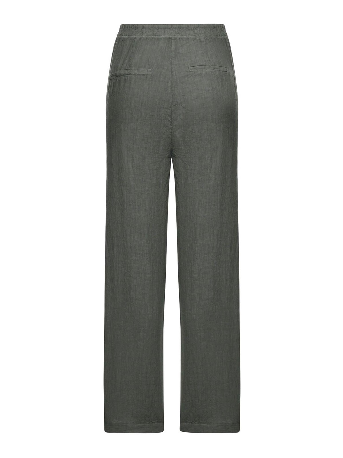 straight fit, wide leg and flowing fit, front button closure with covered fly, inset side pockets, back welt pockets, regular waist, belt loops, straight hem, garment dyed, relaxed fit, color: green