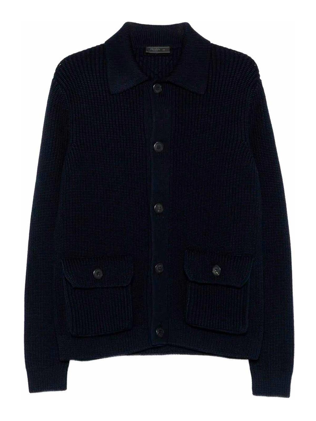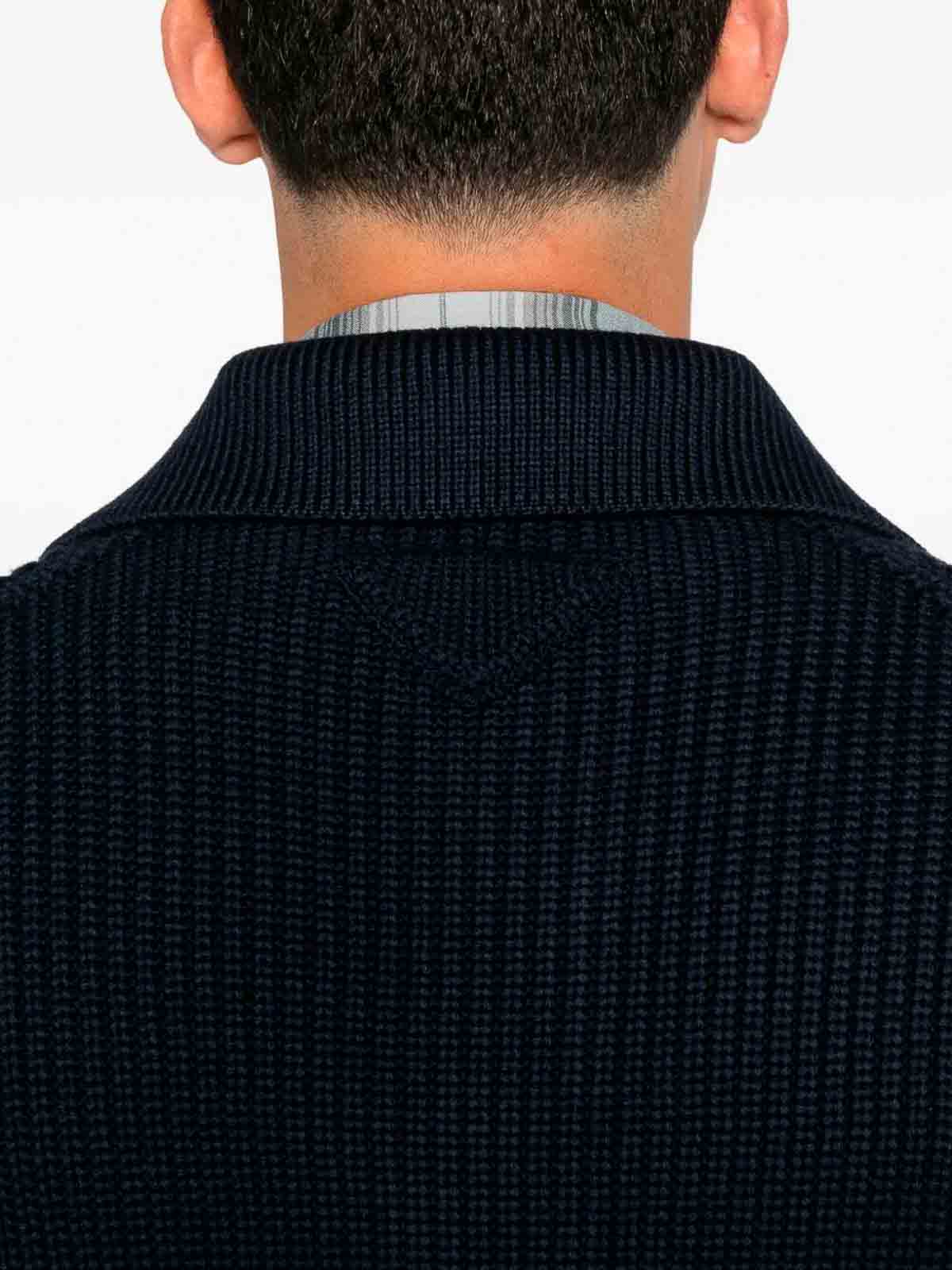 Ribbed workmanship, regular fit, ribbed collar, English shoulder, ribbed cuffs and hem, triangle logo, front button closure, flap pockets
