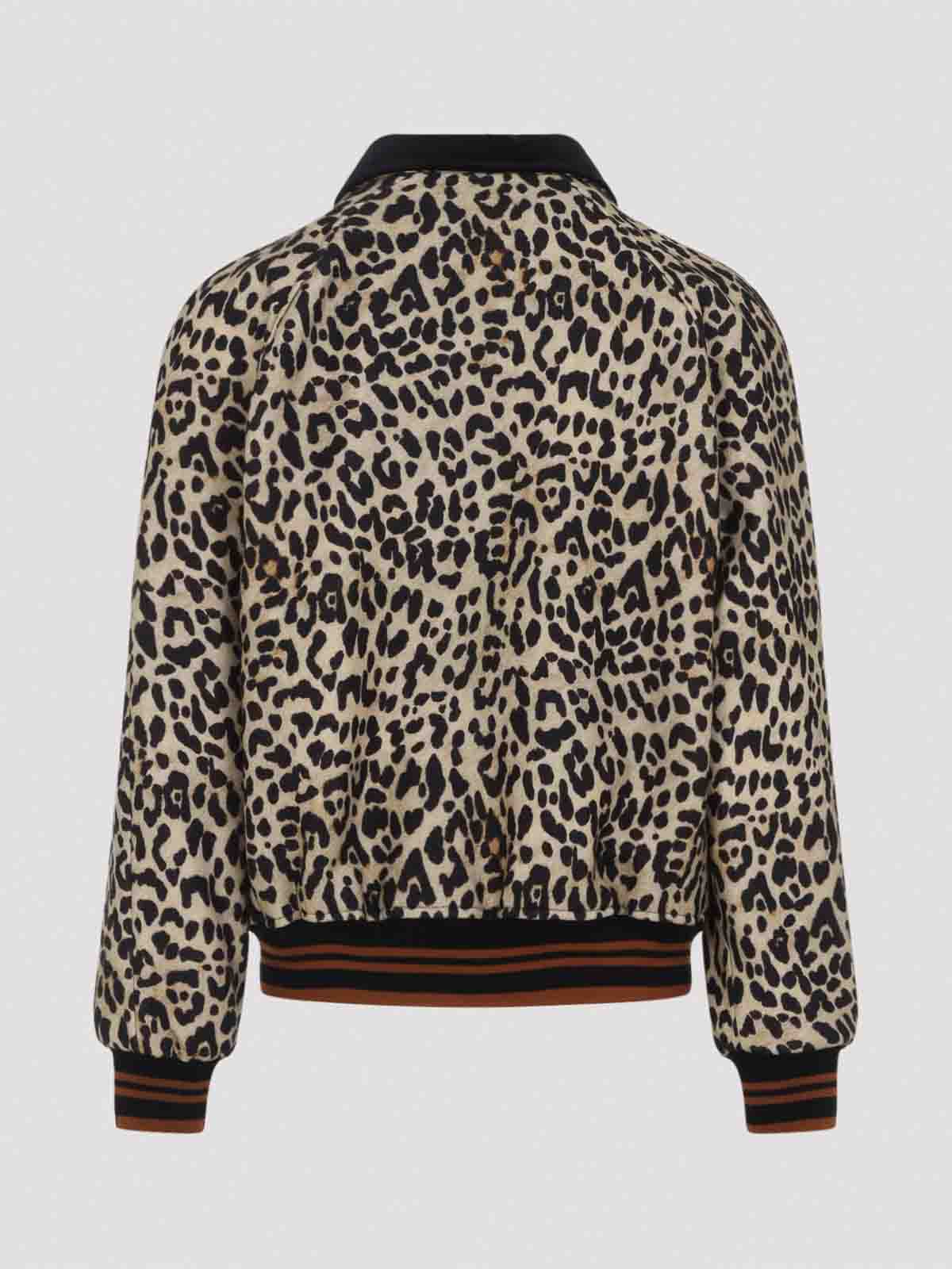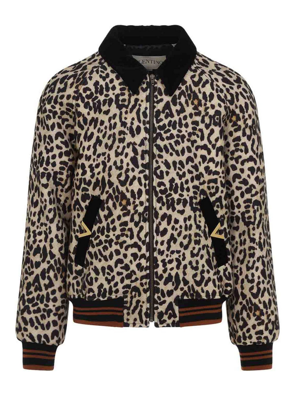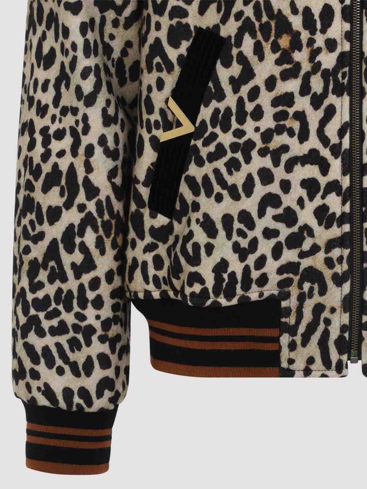 Valentino animalier wool jacket. bomber jacket crafted from animalier wool, featuring a pointed black velvet collar, front zip fastening, two welt pockets with vlogo detail on the front, raglan long sleeves, ribbed brown and black cuffs and hem, and a full lining.