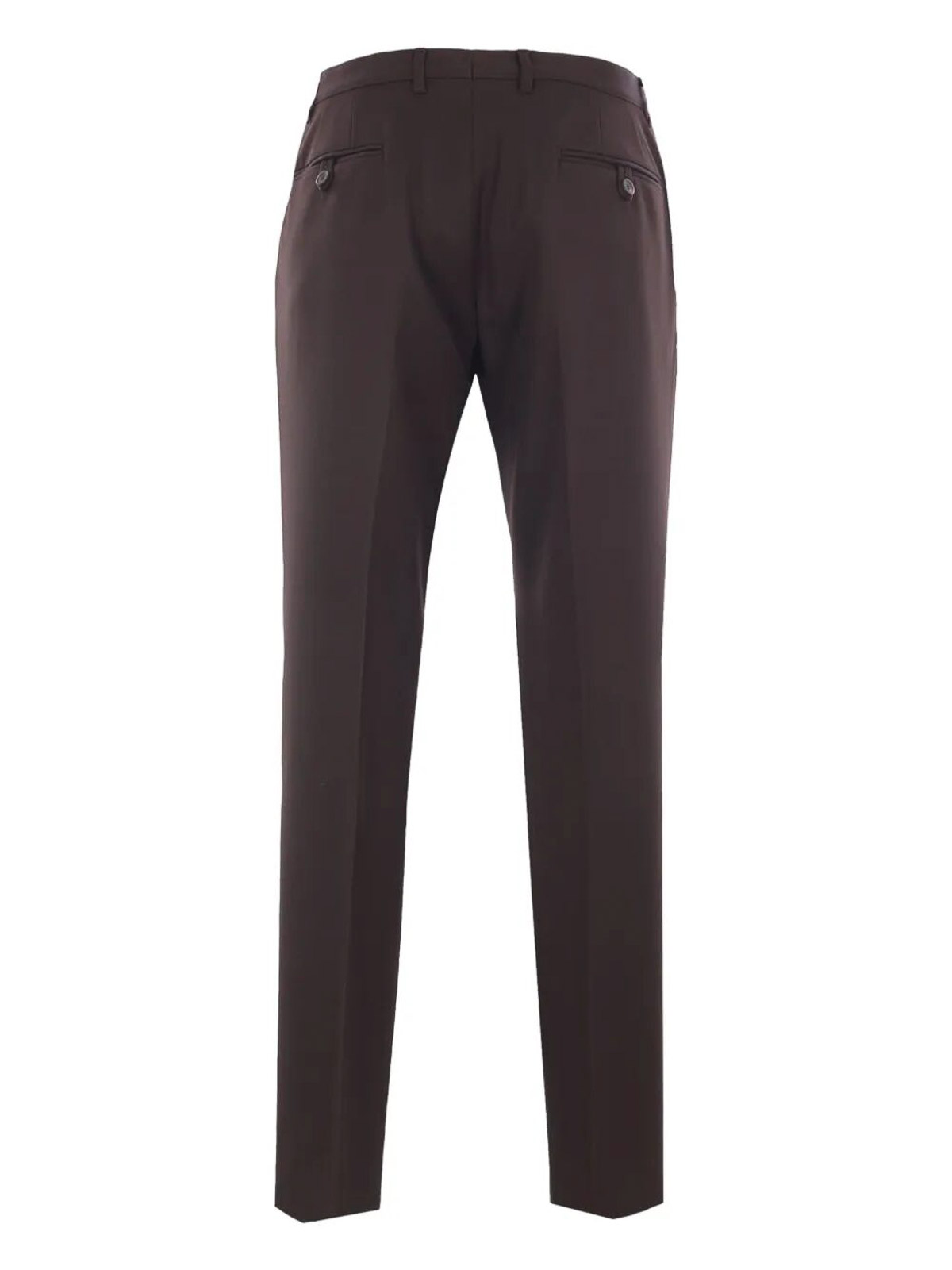 Slim fit, constructed strap, zip and hidden hook closure, front welt pockets, double welt pockets with button on the back, 18 cm bottom, front enamelled metal triangle logo
