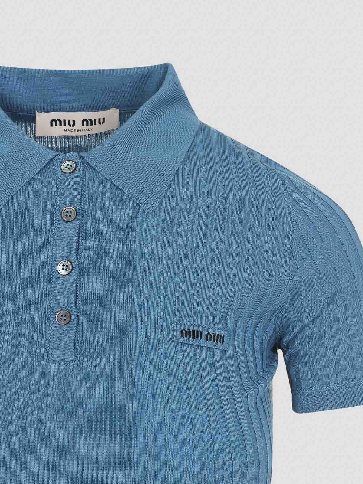 Miu miu blue wool polo. crafted from avio blue fine wool, featuring a ribbed detail that runs from the center across the sides, featuring a polo collar, four-button placket on the front, embroidered logo on the chest, semi-raglan sleeves, slim fit.