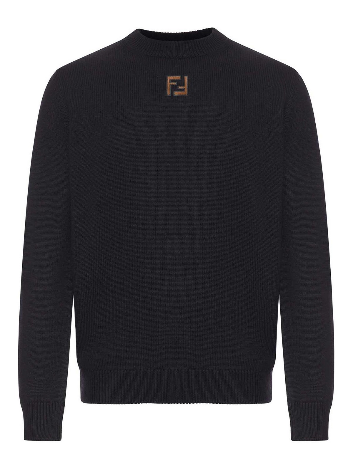 crew neck, long sleeves, ribbed collar, cuffs, and hem, personalized with a brown corduroy micro ff detail on the front, regular fit, 100% virgin wool, color: black/hazelnut