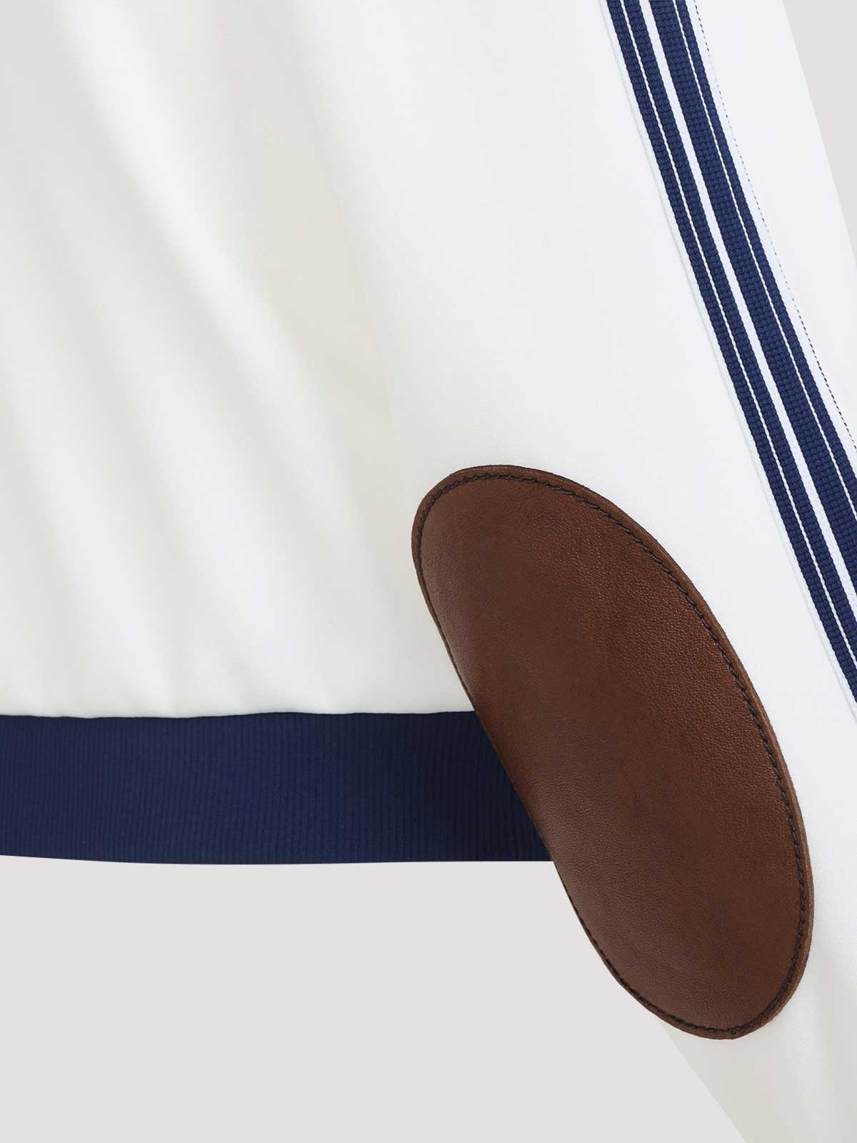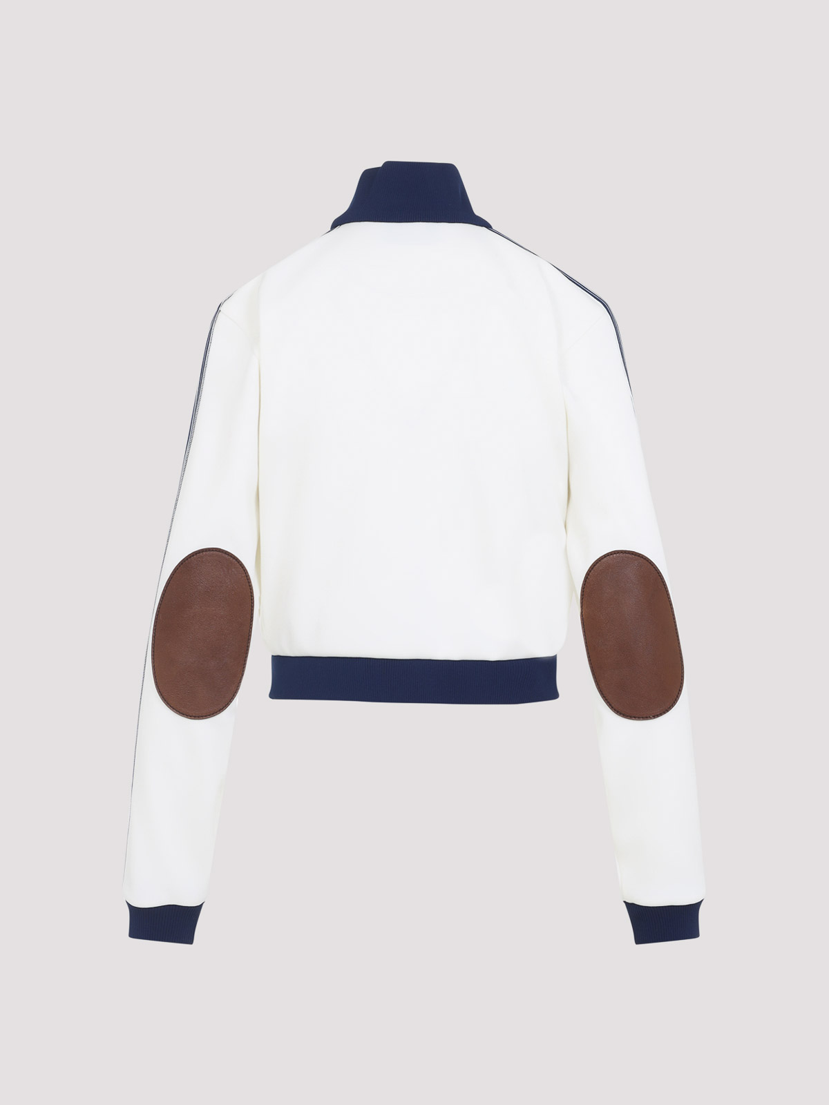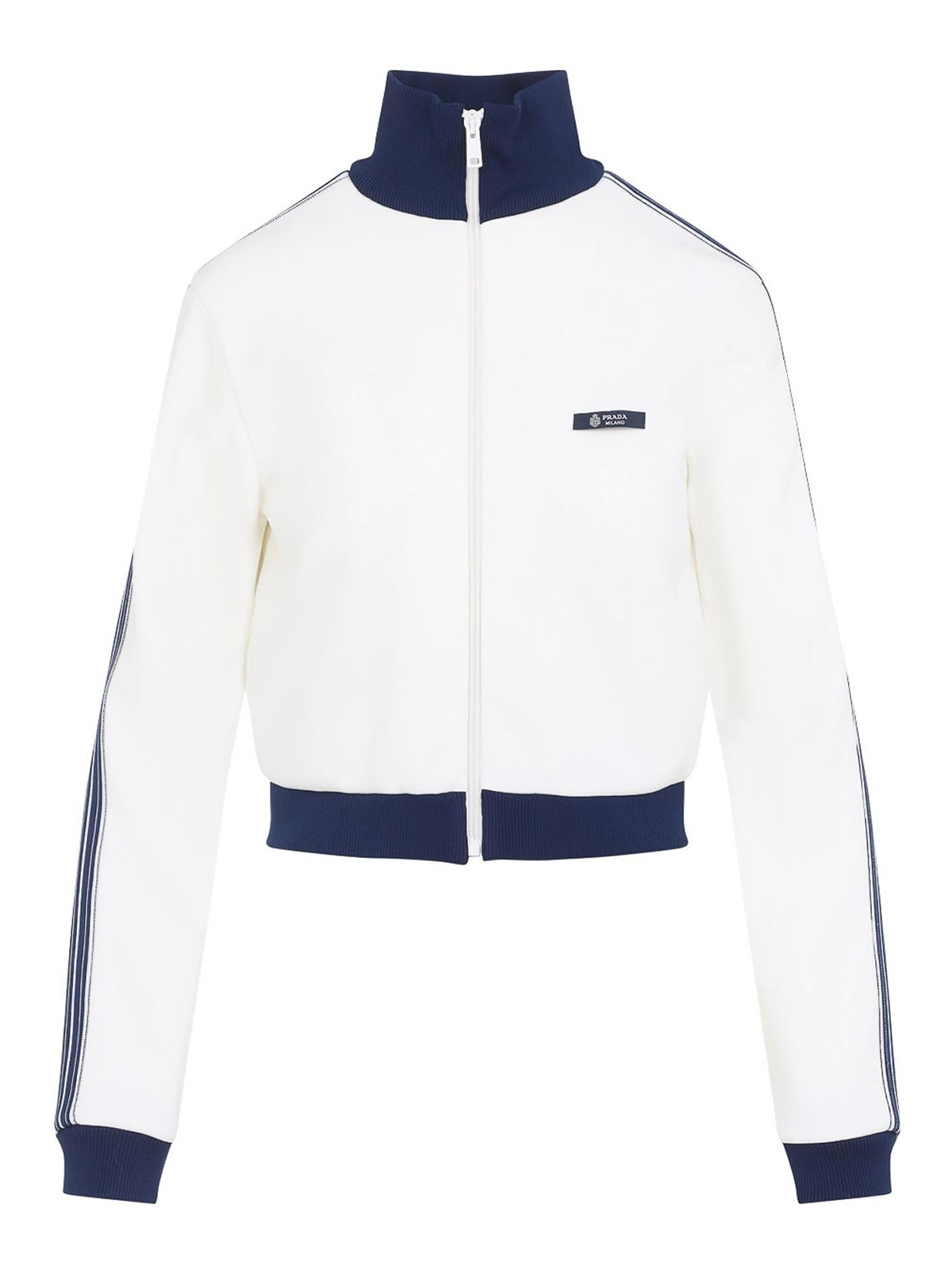 Prada blue and white zip-up logo jacket. blue and white tech fabric, long sleeves, high collar, front zip fastening, logo on chest, ribbed collar, cuffs and waistband. regular fit.