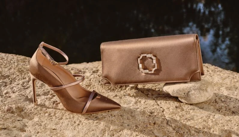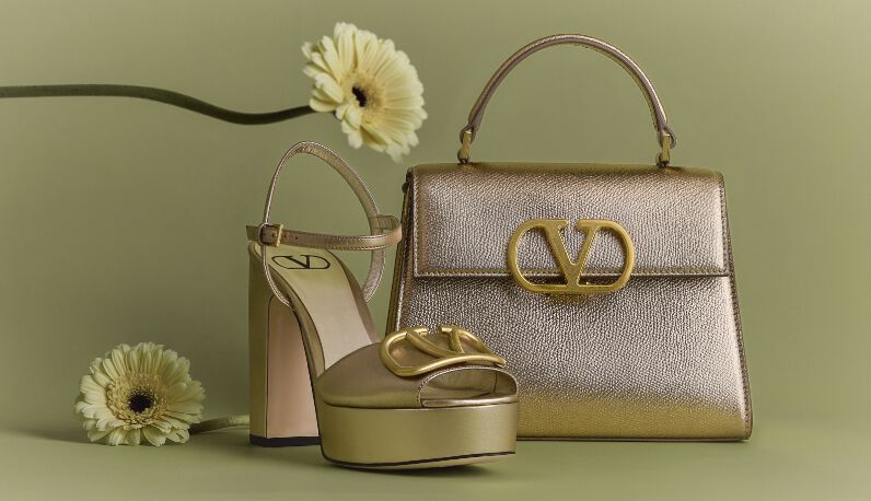 Look to the Italian design house for your Eid capsule pieces including the metallic Vlogo Signature Platform Sandals & handbag